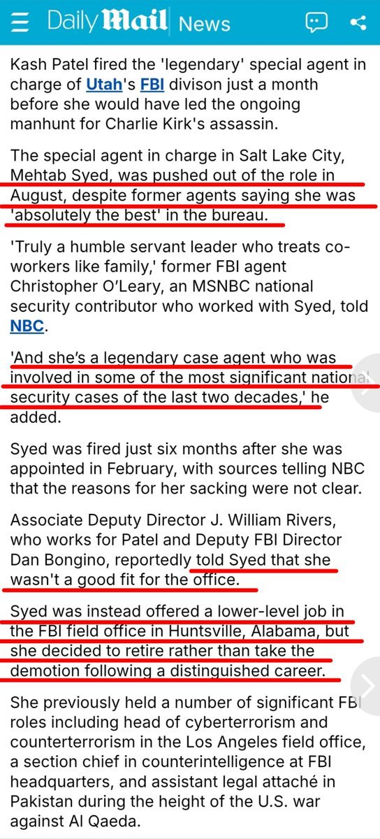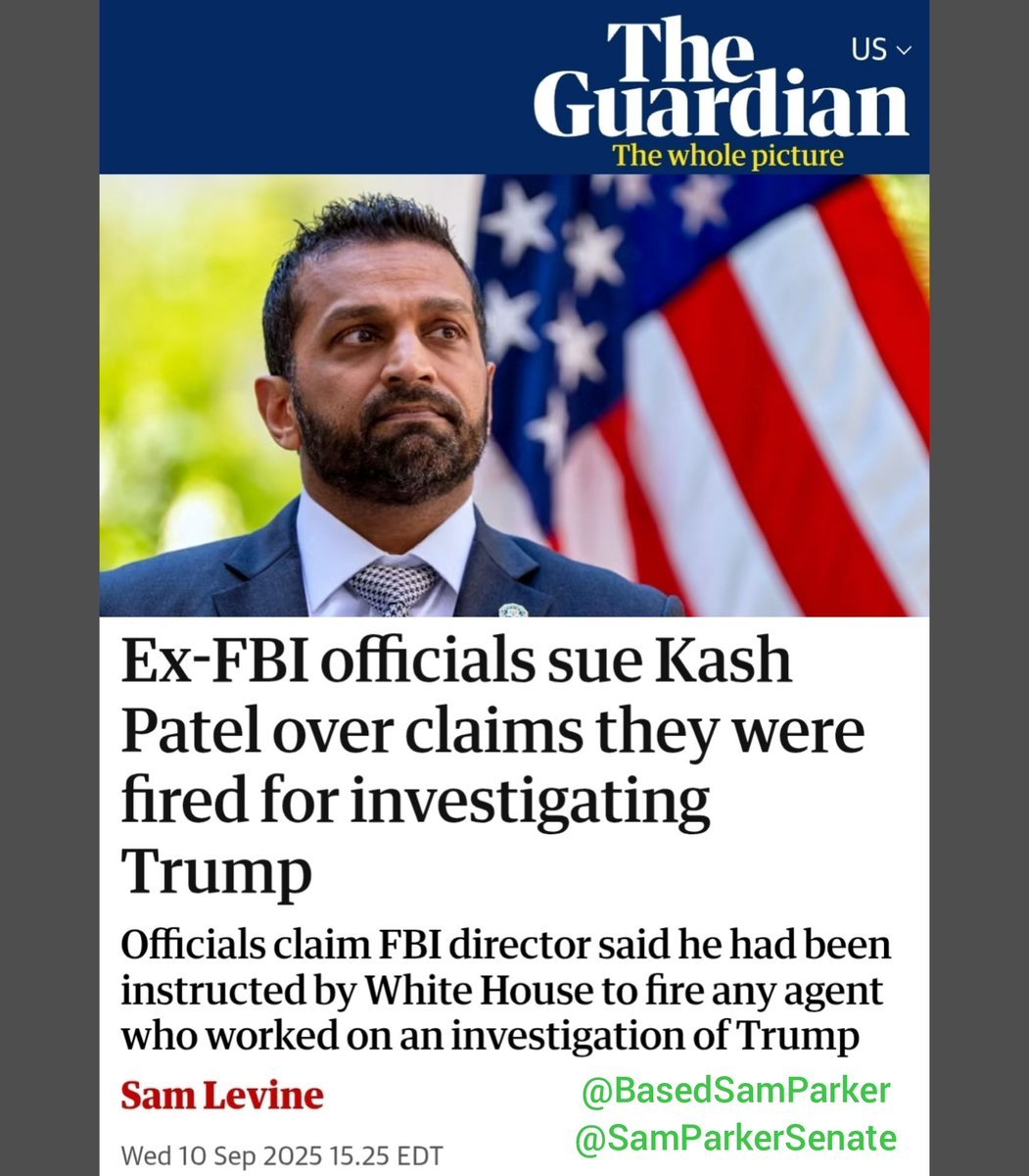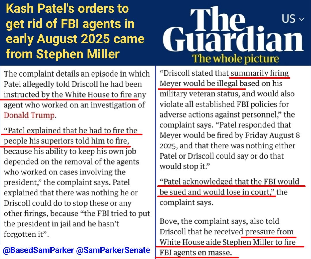 5/ The day Charlie was assassinated, The Guardian ran a story that the order to take action against the fired FBI agents in early August came from White House aide STEPHEN MILLER ✡️! Someone who isn't in any Department of Justice/FBI chain of command. What's interesting is that: 1) Kash Patel admitted that he was forced to make these changes if he wanted to keep his own job. 2) Kash acknowledged that the FBI would be sued over many of these firings and LOSE. Yet they were willing to do it anyway. Now, we get back to the case of Mehtab Syed: she wasn't fired--she was offered a DEMOTION. But why? There it is in black and white: the FBI was not afraid of firing agents, getting sued for it, and losing. Why didn't they take this approach against Syed? Why didn't they just fire her, too? Is it because they didn't want her case going to court? Did they not want that level of scrutiny in her case? Did they want it to quietly go away? No court, no case, no discovery, no scrutiny, NO SPOTLIGHT. BTW, don't notice the ethnicity of the guy who wrote this story. Curiously, this particular article mentions NOTHING about Mehtab Syed. Why not? Did he not want us connecting Mehtab back to Stephen Miller? Was Miller behind her removal, too?
