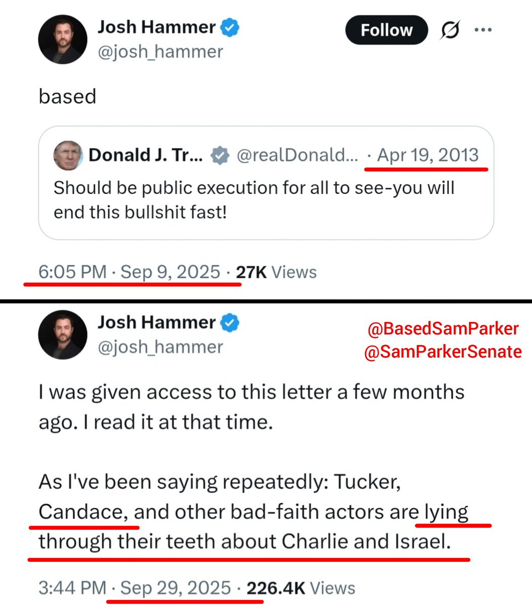 JOSH HAMMER TREACHERY? FACT: Josh Hammer randomly dug up a 12-year old Trump tweet about public executions the night before Charlie was assassinated. FACT: That same night before the assassination, Josh Hammer told us he had a meeting with Charlie wherein he claimed Charlie hadn't changed his mind on israel. He neglected to say anything about Charlie's group chat statement from the previous day. FACT: Josh Hammer was in the group chat where Charlie admitted he was going to have to abandon the pro-israel cause, yet Hammer remained completely silent about this and called Candace Owens a liar for claiming Charlie's stance on israel was shifting. FACT: Josh Hammer knew about the letter to Netanyahu, but remained quiet and let others break the story. Why is Josh Hammer calling people liars for making true claims while remaining silent on key pieces of insider information himself that refute his own claims? Watch Josh Hammer tell you about being in the group chat and tell you Charlie wasn't shifting his stance. This is now confirmed to be untrue and it turns out Candace Owens was telling the truth. Why did hammer lie about Candace and not produce this information himself?