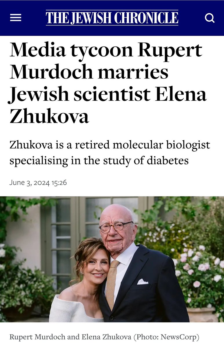 11/ Let's jump back into the Media: Newscorp titan Rupert Murdoch--the guy who owns Fox News, the most pro-israel TV station on he planet outside of israel. Here's his current wife, Elena Zhukova.