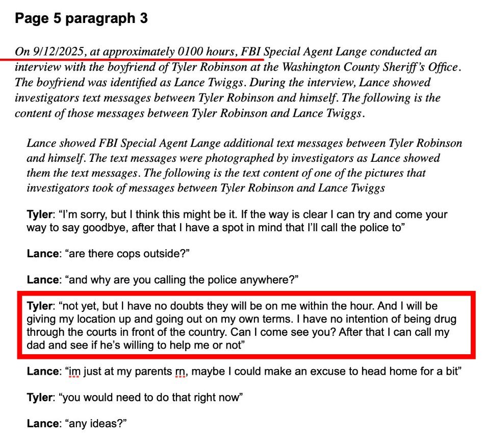 OMGOSH: The original plan was for Tyler Robinson to be k*lled in a shootout! Just as we've suspected. @Villgecrazylady @RealCandaceO @baroncoleman Follow closely because it's a little confusing: In the newly released text messages, which trace back to first being divulged to the FBI by Lance Twiggs at 1 AM September 12th (the same nighttime that Tyler turned himself in), Tyler allegedly states he's going to call the cops to a certain location to "go out on my own terms. I have no intention of being drug through the courts." These messages were meant to be the paper trail for the shootout that The Conspirators had planned for him. These messages are Version 1.0. But that's not what Tyler did. He didn't call the cops and go out on his own terms. Fate, God, a family member—something or somebody intervened—and he didn't follow whatever the original plan was. He turned himself in instead, ruining the shootout plan The Conspirators had pre-arranged for their patsy. That's why the text messages in the Indictment from September 16th say that "Im gonna turn myself in willingly." These messages were the adjustment made in the aftermath of Tyler turning himself in on the evening of the 11th, ruining the plan. These messages were actually Version 2.0. But when Lance Twiggs shared the text messages from the original plan—on what was essentially also the evening of the 11th (1 AM September 12th is basically the night of the 11th still)—The Conspirators hadn't yet had time to react to Tyler going off script. All Lance had at that moment was Version 1.0. So that's what he shared. And that's what made it into the FBI file. And that's what's been newly released. By September 16th, The Conspirators had had time to react and they forged new fake text messages of Tyler saying he was going to turn himself in, because that's what Tyler ended up doing. Again, these were Version 2.0. But the texts that Lance Twiggs shared the night Tyler turned himself in reflected the original plan, Version 1.0: Tyler was going to meet the cops and "go out on his own terms." They had planned to mow Tyler down, release the Version 1.0 fake text messages of Tyler saying he was going out on his own terms, and wrap everything up in a nice little bow. What's that they say about the best laid plans of mice and men? Tell me if I'm reading this wrong. ▪️September 16th Indictment texts below left (Version 2.0) ▪️Newly released text messages from the early morning of September 12th below right (Version 1.0)