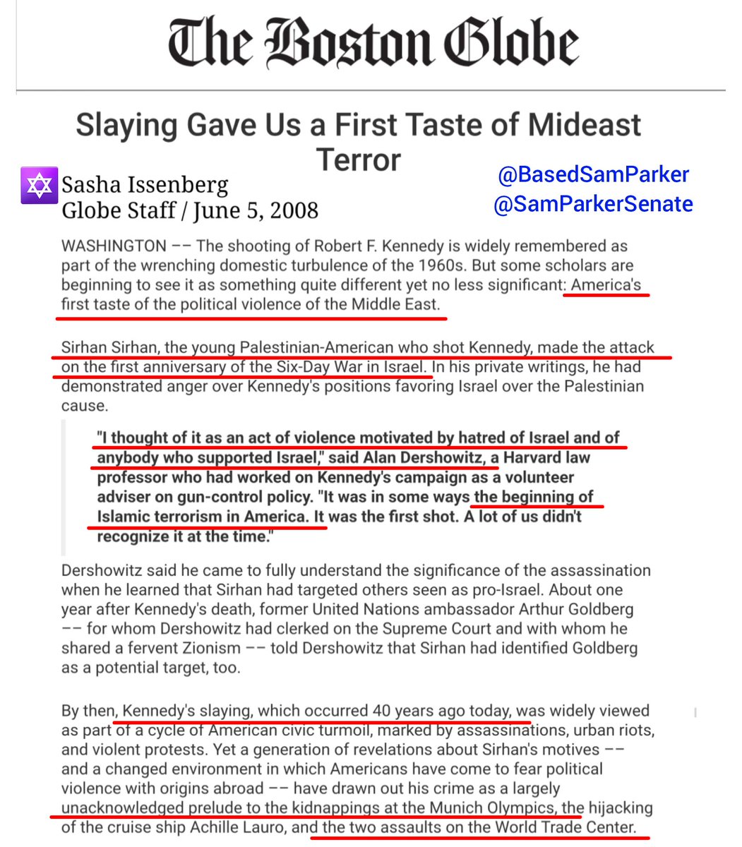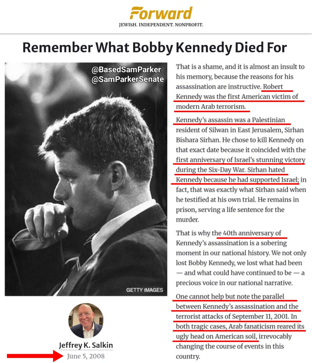 13/ But it's not just Oliver Stone & Arnon Milchan. There's been a concerted effort for years to pin the murder of RFK on the Palestinian Sirhan Sirhan. For example, multiple articles on the 40th anniversary in 2008 reinforced the conventional narrative. In these articles by jеwish journalists, Sirhan's assassination plot is claimed to establish Arab/Muslim terrorism, is likened to 9/11 (another fake flag! Lol), and again repeats the talking points about the 6-Day War & Sirhan's hatred of israel.