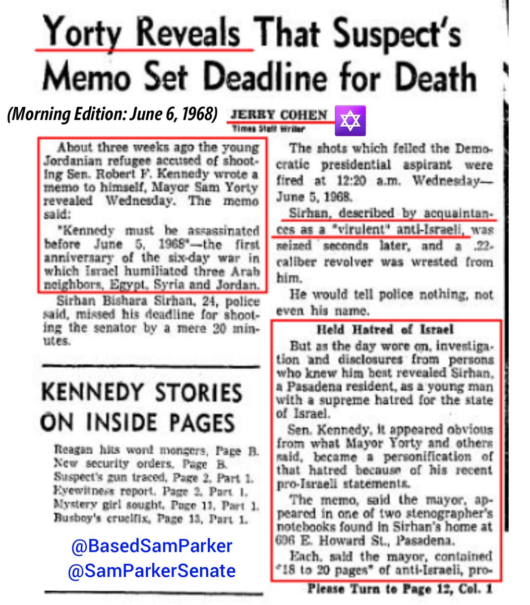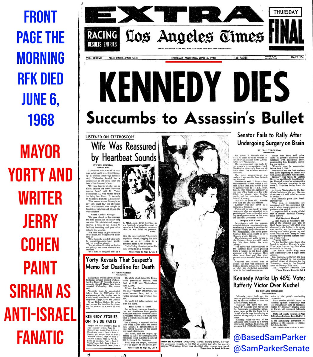 14/ NEW CHARACTER ALERT: JERRY COHEN But where did these talking points come from? How were they originally established? All the way back on the day of RFK's death: June 6th, 1968. On the front page of the morning edition of the Los Angeles Times on June 6th--mere hours after RFK died--jеwish columnist Jerry Cohen announced to the world how Sirhan wanted to complete his anti-israel vendetta by the 1-year anniversary of the 6-Day War, and that RFK personified his "virulent anti-israel" hatred.