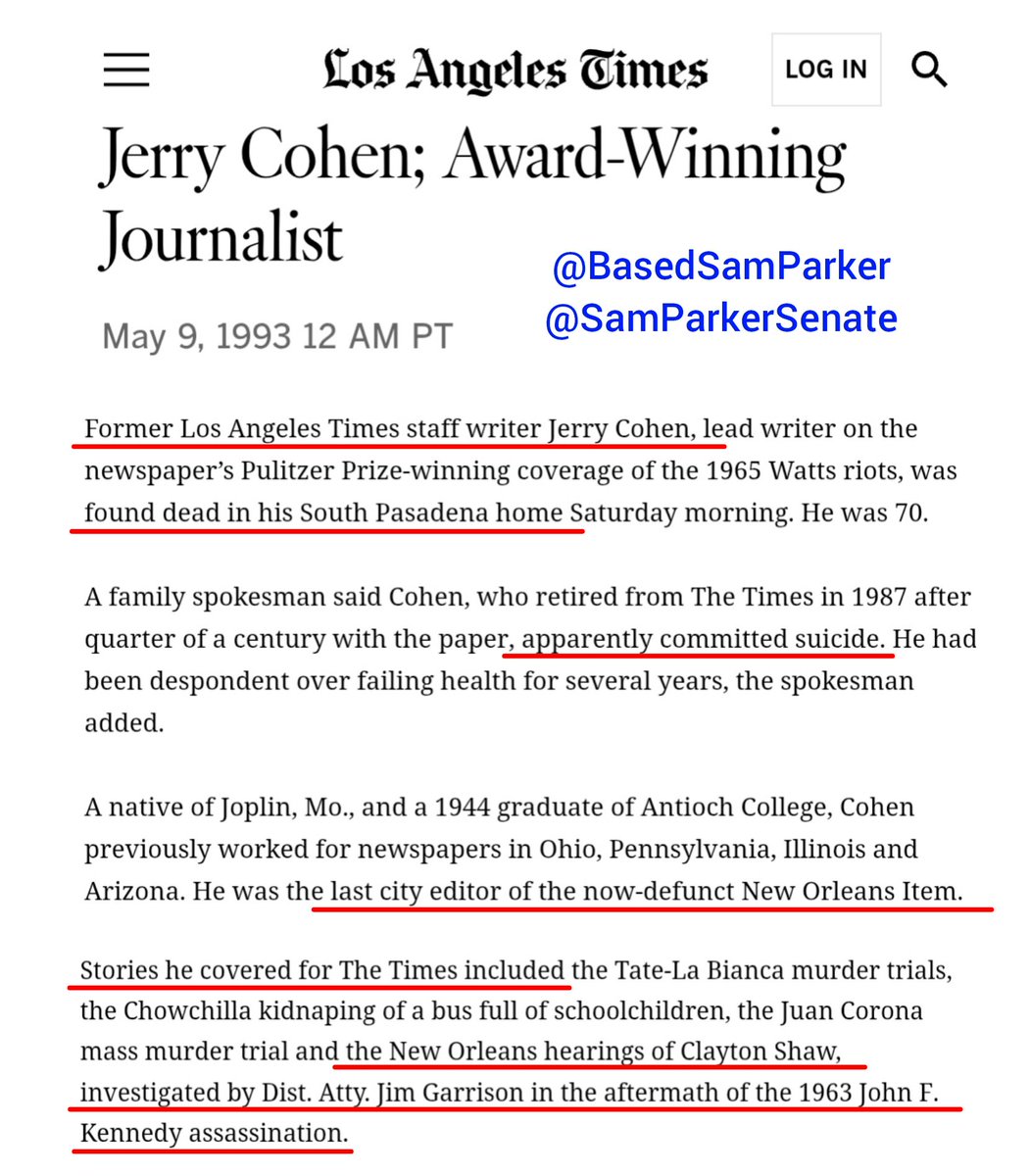 15/ Let's take a closer look at Jerry Cohen: ▪️Was found dead in his home in early 1993 of an apparent suicide. ▪️Was once a journalist in New Orleans ▪️Covered the trial of Clay Shaw, the man investigated by Jim Garrison for involvement in the assassination of JFK--the very case and character upon which the film "JFK" was based! Just tell me that's not one hell of a COHENcidence.