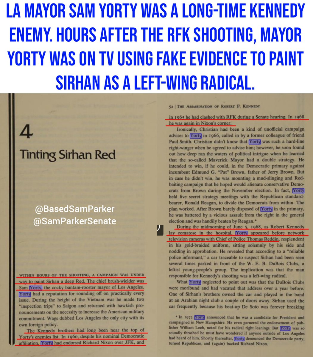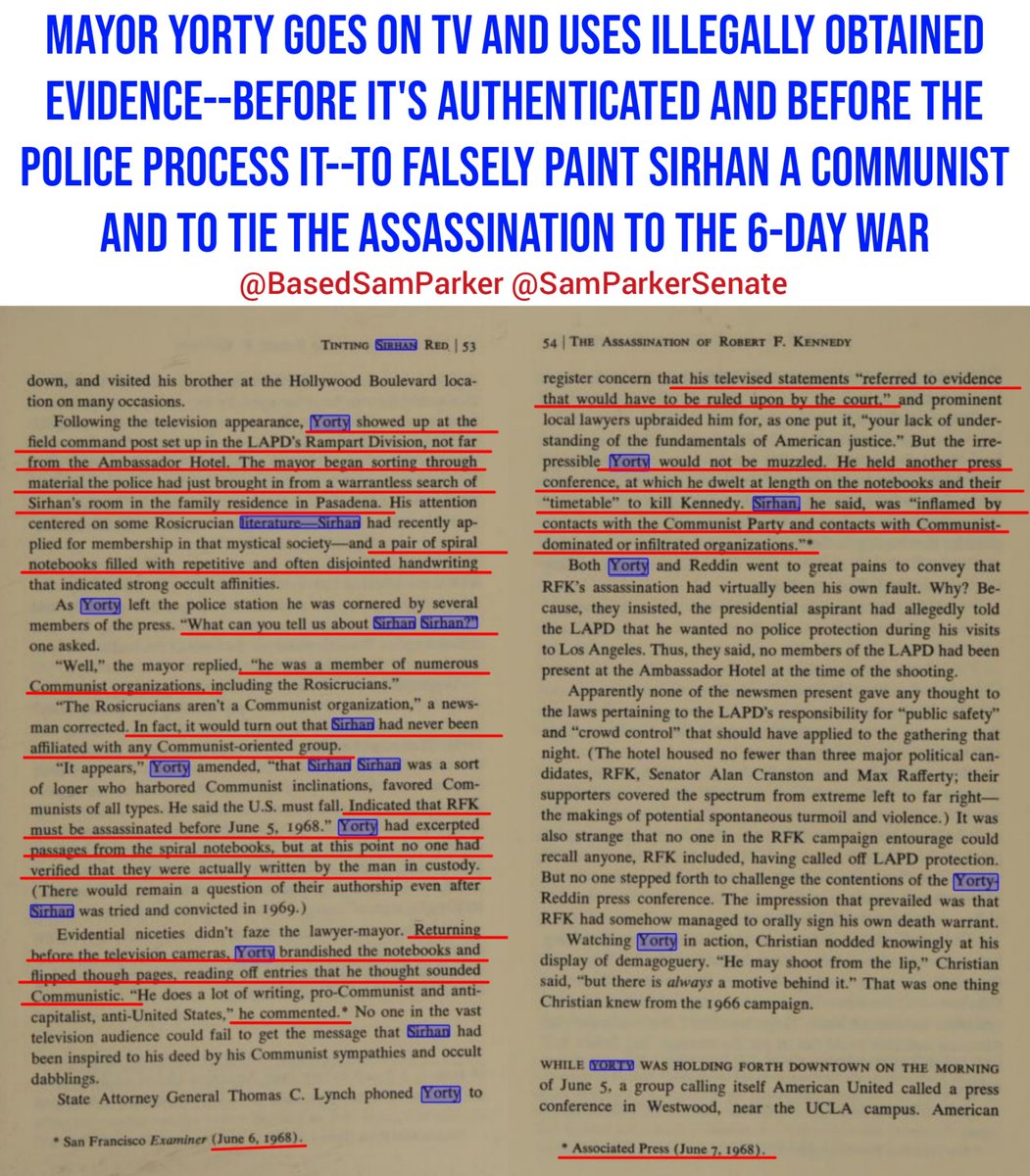 17/ NEW CHARACTER: LA Mayor Sam Yorty Circling back to RFK, where did Jerry Cohen get his narrative talking points on Sirhan Sirhan? As you can see from the newspaper article from June 6th a few tweets above, he says he got the information from the mayor of Los Angeles, Sam Yorty. Additionally, on June 5th & 6th, 1968, Mayor Yorty appeared in multiple televised press conferences wherein he used illegally obtained, and unauthenticated evidence (that the police hadn't even processed yet) to proclaim that Sirhan was a radical leftist communist, and that he was committed to killing RFK by the 1-year anniversary of the beginning of the 6-Day War. Sam Yorty was a long-time political enemy of the Kennedy family, and even though he was a fellow Democrat, he endorsed Nixon rather than JFK in 1960. In 1968, when RFK was running, he was again a Nixon supporter. The communist angle on Sirhan was later proven false. And I think it's time we call bullshit on the whole thing.