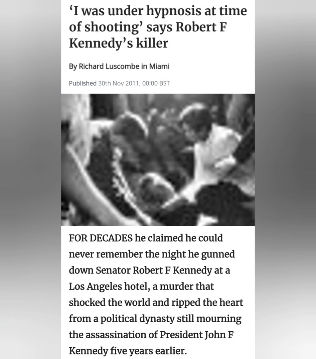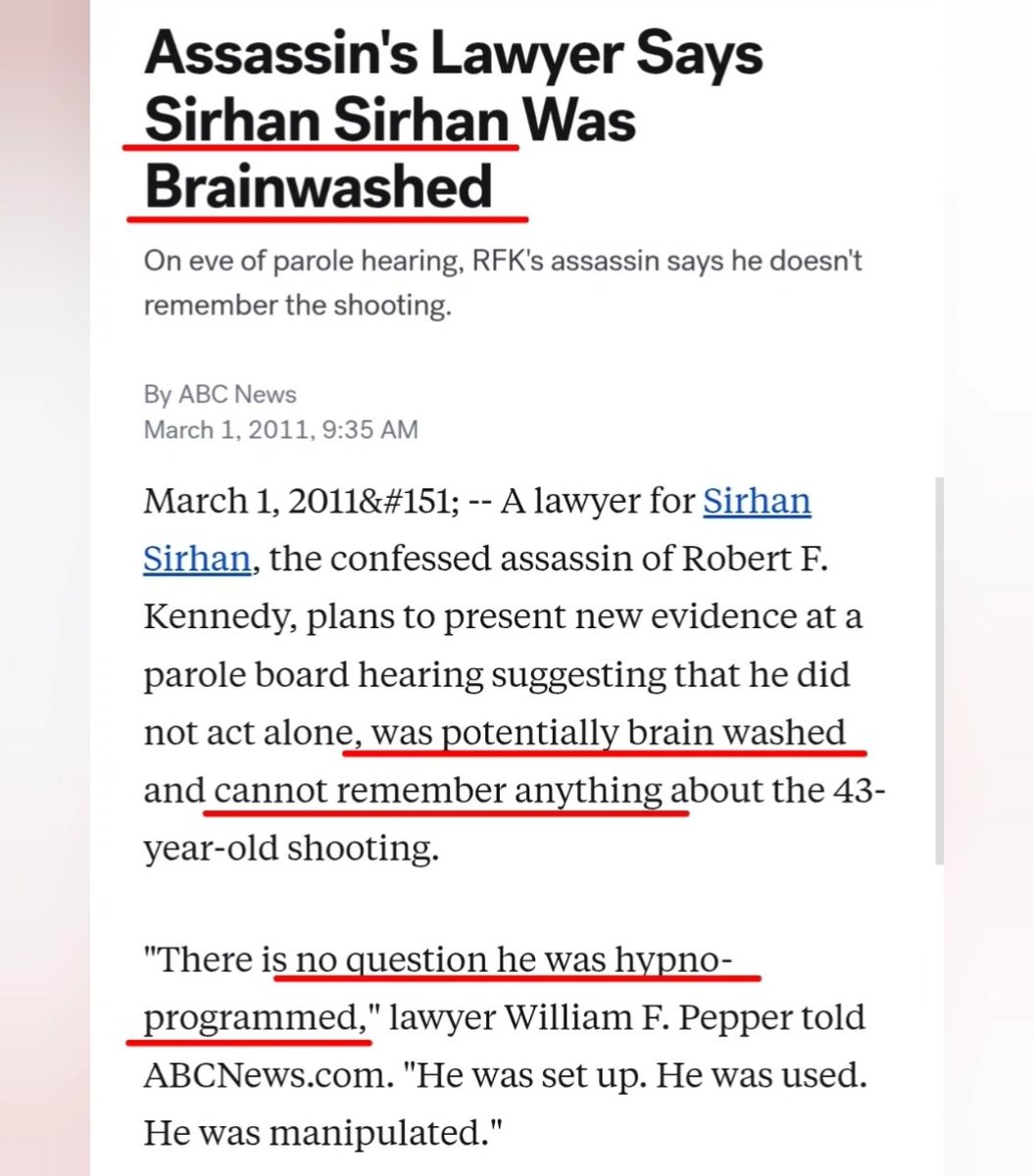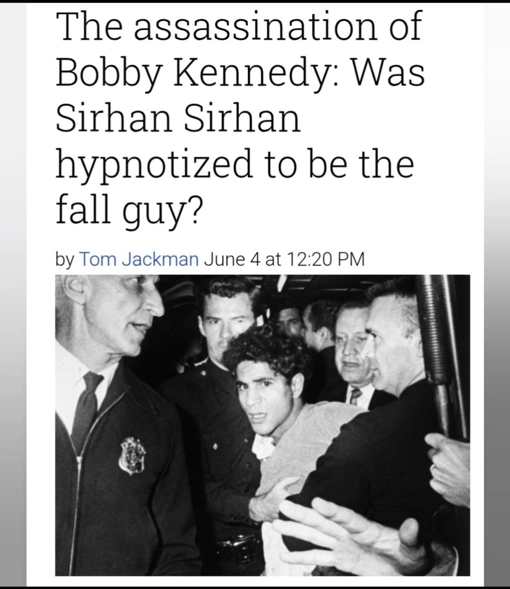 23/ That takes us back to June 5th, 1968. Sirhan Sirhan still maintains his innocence, and claims he can't remember anything about that night. Doctors and experts have questioned & examined him over the years, and some are convinced that he was under hypnosis, or brainwashing. MK-Ultra type of stuff.