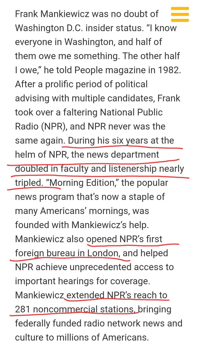 7. Frank went on to head National Public Radio, NPR, for 6 years. During his tenure, he increased that propaganda operation to 281 stations and tripled the listenership. https://t.co/4aYQbjCT7t