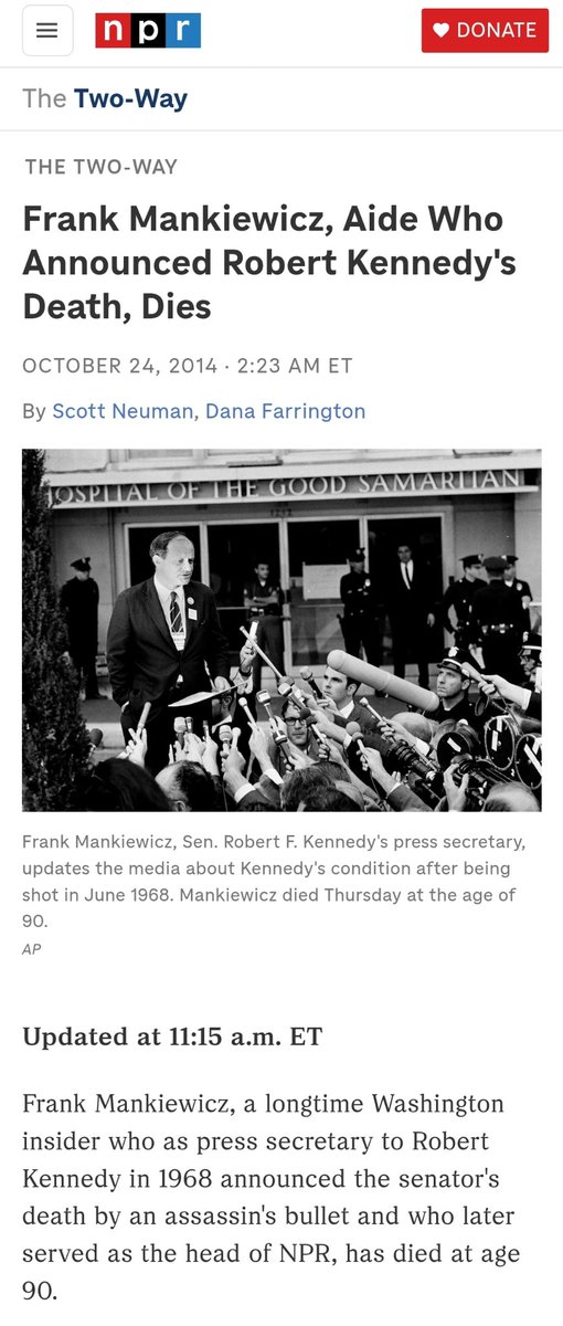 2/ After having led RFK to his death in the kitchen on June 5th, Frank Mankiewicz famously delivers the news of RFK's death to the world on June 6th, 1968. Look how convincingly he sells the deception of his involvement. https://t.co/gWdJTUTKRg