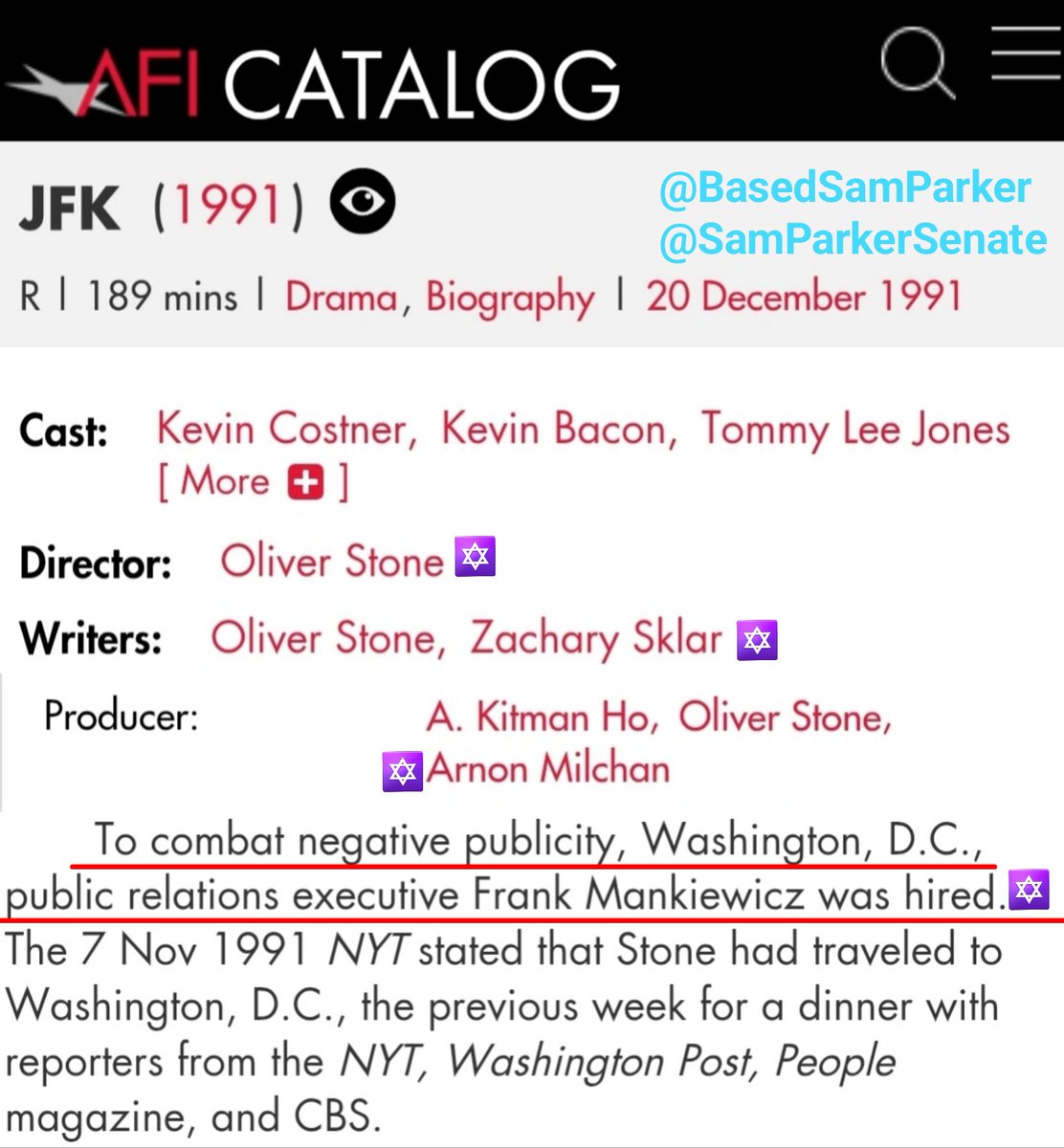 8/ But Frank's "magnum opus" was his PR work for the film "JFK," surely one of the greatest propaganda efforts ever committed to celluloid. The movie was written, produced & directed by jеws--and blames the CIA & military industrial complex for the JFK assassination. Not one word about israel, Mossad or nukes.