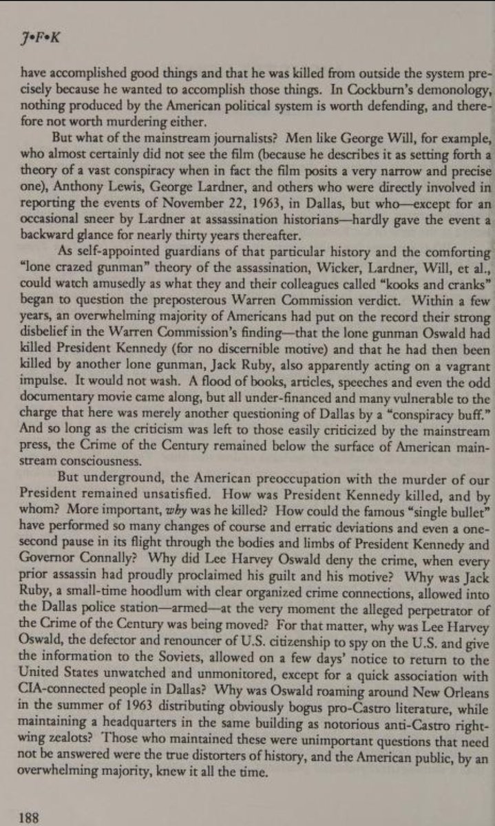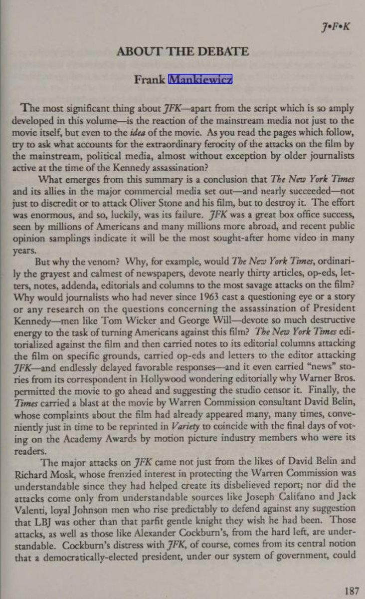9/ In "JFK: The Documented Screenplay," Frank Mankiewicz vigorously defends the film against its vicious attacks in the press, led by the jewish New York Times. This is kosher theater of the highest order, a real kosher sandwich--designed to elevate the film. The public was herded into one of two camps: Lee Harvey Oswald acted alone, or the CIA/MIC conspiracy did it. No room for israel in this artificial dialectic.