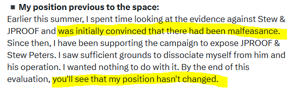 LONG POST ON JPROOF AND UNCENSORED AI (UAI) You've seen the battle raging online over JPROOF and UAI. Here are my lengthy thoughts. First: Yesterday's Twitter Debate Over JPROOF & The Allegations That Stew Peters Committed Fraud ▪️My position previous to the space: Earlier this summer, I spent time looking at the evidence against Stew & JPROOF and was initially convinced that there had been malfeasance. Since then, I have been supporting the campaign to expose JPROOF & Stew Peters. I saw sufficient grounds to dissociate myself from him and his operation. I wanted nothing to do with it. By the end of this evaluation, you'll see that my position hasn't changed. ▪️The Space Itself: I thought team Lucas Gage came prepared with many receipts to back up their several allegations, with varying degrees of convincing power on the audience. Stew seemed to have an explanation for virtually all of the accusations, but it must be noted that he himself didn't present receipts as they did. We were simply asked to trust his explanations. I found his answers to have varying degrees of believability. He didn't necessarily win me over in total, but I thought some, maybe many, of his answers were plausible. Several people in both camps spoke, with "expert" allies of each side taking predictable stances for or against. ▪️Results: I believe team Lucas succeeded in demonstrating that Stew & his team made mistakes and that the whole management of JPROOF was riddled with incompetence & confusion. However, I'm not sure that they succeeded in proving to the audience that Stew acted with overt malice or premeditated determination to commit fraud & scam people. Having said that, I'm not positive he didn't, and they did succeed in making me pretty suspicious, just as they had earlier in the summer. I'll put it this way: Would I bet money that Stew is innocent? No, I would not. Would I bet money that he's for sure guilty of all counts as charged? Also, no, I would not. Simply put, I'm just not certain one way or another. I realize I just don't know enough or am expert enough in crypto. But I'm very suspicious. ▪️Conclusions: What I am sure of is that Stew has needlessly told lies about Lucas and his family. Lies that I know for sure to be false and am certain Stew also knows to be false. I understand he was fighting back against Lucas's JPROOF accusations, but rather than keep the focus on the allegations, Stew smeared Lucas & his family. Therefore, I don't trust him and can't take his answers in the space at face value. That tips the scales for me. As Lucas said, "Stew came up, he said what he did. If you believe Stew now, that's on you." I echo that. Everyone has laid their cards on the table as much as they're going to be laid on the table. We've now had the best hearing we're going to get. What each person decides to do from here onward regarding JPROOF is on everyone individually. ▪️Final Note: After hearing from 3rd-party spectators and supporters of both camps, I can sympathize with the wide range of final opinions on this. As I'm not sure any definitive "kill shots" were landed by either side, I won't begrudge or attack anyone for taking the side they end up taking. However, as I said for my part, I don't trust Stew and won't be taking his side. Your use of JPROOF or association with it or Stew Peters is now on you.