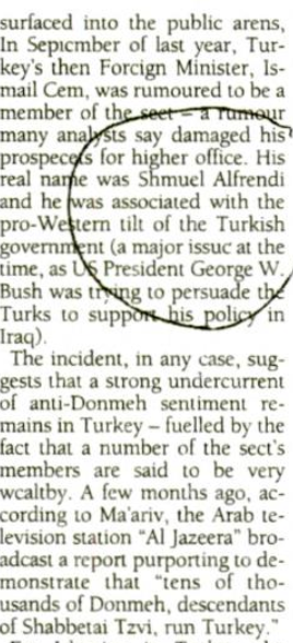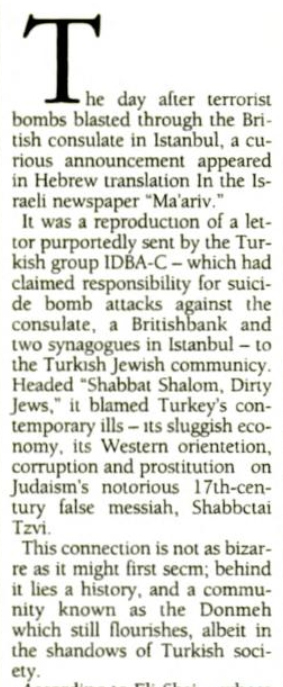 2/6 He begins by talking of a bomb attack on a synagogue, and the perpetrators blamed Dönmeh for various ills of the Turkish society :