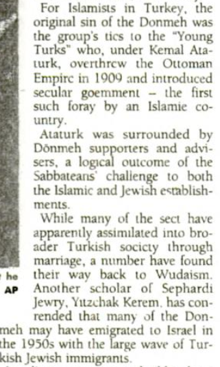 5/6 "For Islamists in Turkey, the original sin of the Donmeh was the group's tie to the "Young Turks" who, under Kemal Ataturk, overthrew the Ottoman Empire (...) Ataturk was surrounded by Dönmeh supporters and advisers (...)"
