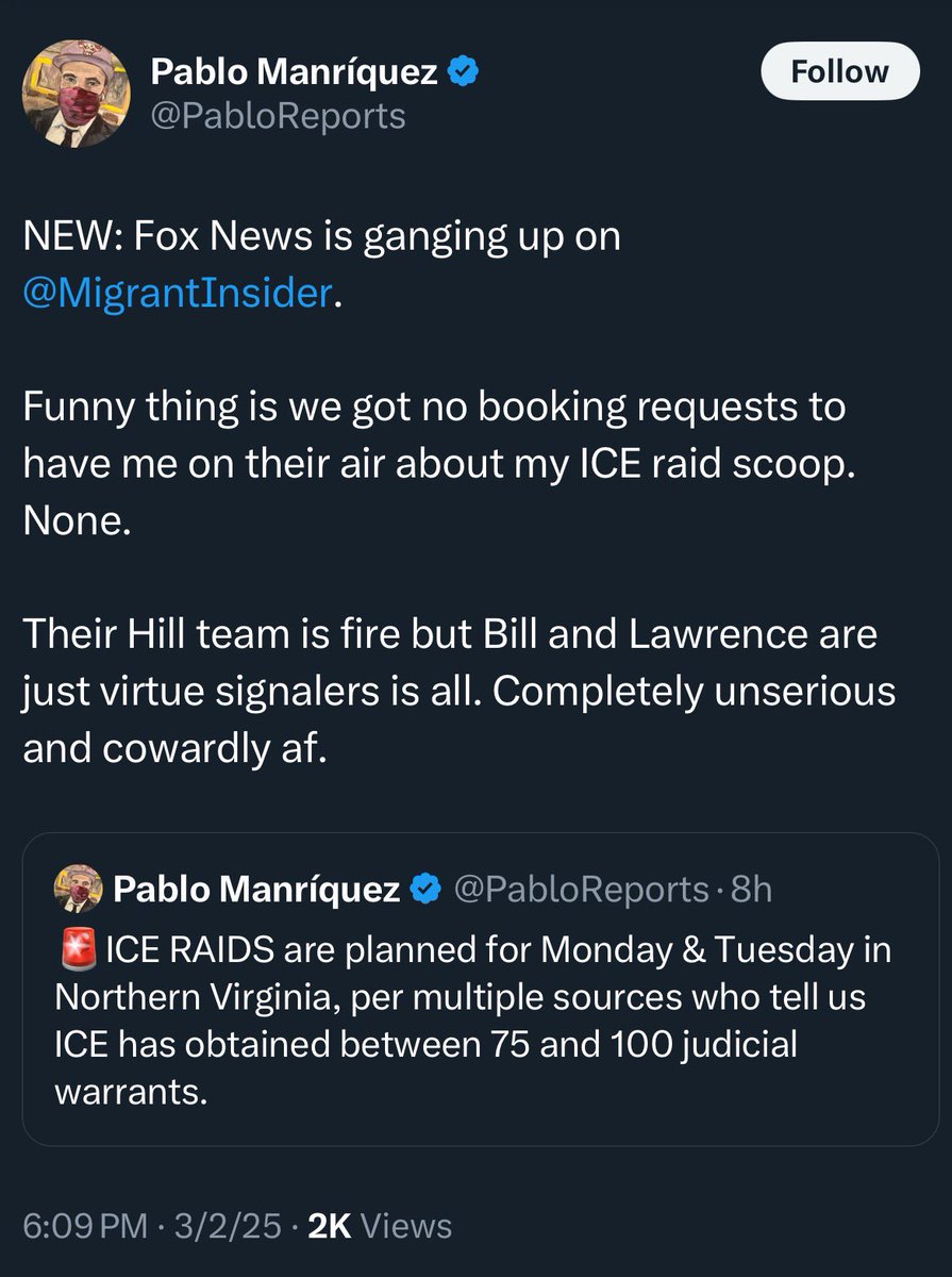 Joined @IngrahamAngle to discuss the latest on leaks of ICE operations. In this case, an open borders activist got a leak, gave criminal alien targets in VA a heads up, then urged them to “prepare accordingly” for ICE to potentially enter their homes w/ warrants & coached them to stay off of highways due to VA state police cooperating with ICE. While his attempt to interfere with the serving of federal judicial warrants against criminal alien targets may be ethically abhorrent & dangerous to law enforcement, the true issue lies with whoever leaked him the operational details. Details of ICE operations have now leaked in Virginia, Los Angeles, Aurora, and Chicago. The problem appears to be getting worse, rather than better, and despite promises of consequences for leakers, none have been announced yet.