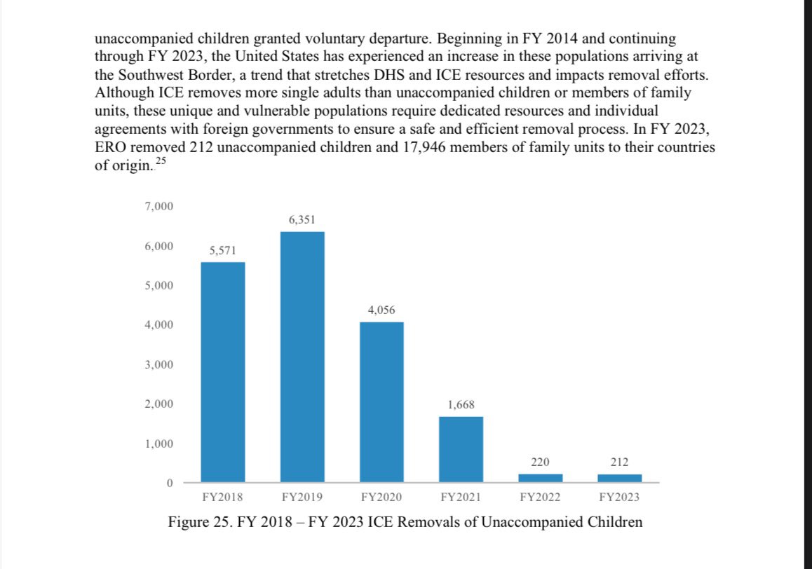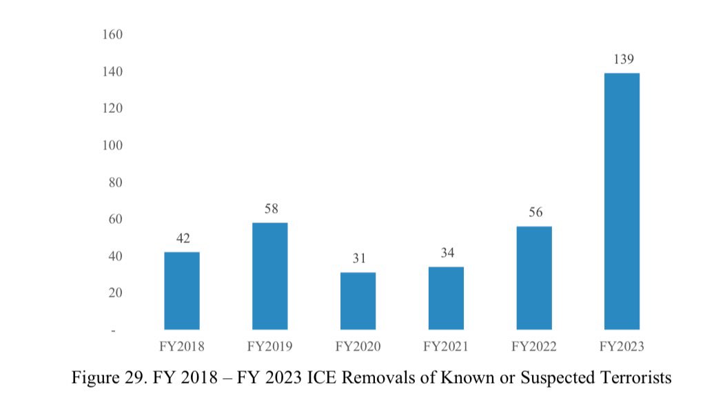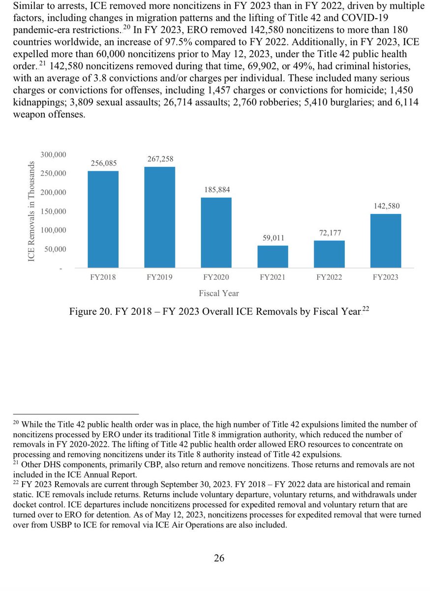 BREAKING: ICE just dropped its FY2023 report. Highlights 👇🏻 - ICE made 142,580 deportations, nearly doubling FY’22, but still a small fraction of the nearly 2.5 million southern border migrant encounters in FY’23 & a steep drop from Trump years. ICE says Title 42 lowered deportation numbers, & they expelled over 60,000 via Title 42, which aren’t deportations. - The non-detained (released) docket has exploded to over 6 million, almost doubling under Biden since the Trump years. This includes illegal immigrants who have been issued final orders of removal, as well as those with pending cases, which includes those who were issued notices to appear. - ICE removed only 212 unaccompanied minors in FY’23, despite 137,275 arriving at the southern border in FY’23. The Biden administration is removing less than a drop in the bucket when it comes to these unaccompanied minors. - ICE deported 139 known or suspected terrorists in FY’23, a huge jump from recent years reflecting more terror watchlist suspects arriving at the southern border than ever before. Previous high in last six years was 2019 with 58 terror removals. Overall takeaway: ICE enforcement up significantly from FY’22, but still a small fraction compared to the millions coming across the border. ICE enforcement during Trump years was significantly higher despite much smaller numbers of people coming across the border. For perspective, Trump’s worst year was 2019, when there were 851,000 migrant encounters at the southern border. Biden just had back to back years of 2.3 million and 2.4 million, and Trump’s ICE removals were still significantly higher. Link to FY’23 ICE report: https://www.ice.gov/doclib/eoy/iceAnnualReportFY2023.pdf