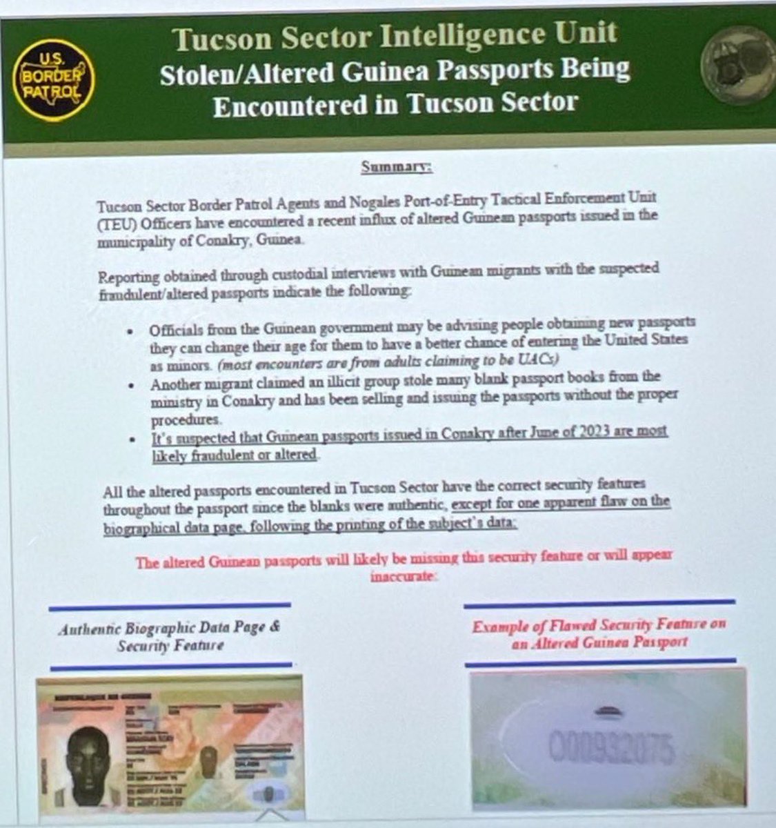 NEW: Per an internal alert sent out by Border Patrol’s Tucson, AZ sector intel unit, some illegal immigrants from Guinea are using fraudulent/altered passports to change their age & masquerade as unaccompanied minors in an effort to get into the U.S. The notice says agents have seen an influx of these fraudulent Guinea passports, it warns them on what to look out for, and advises that any passports issued in the Guinea municipality of Conakry after June 2023 are “most likely fraudulent or altered.” Hundreds of adult men from Guinea have been crossing illegally in the Tucson sector every day.