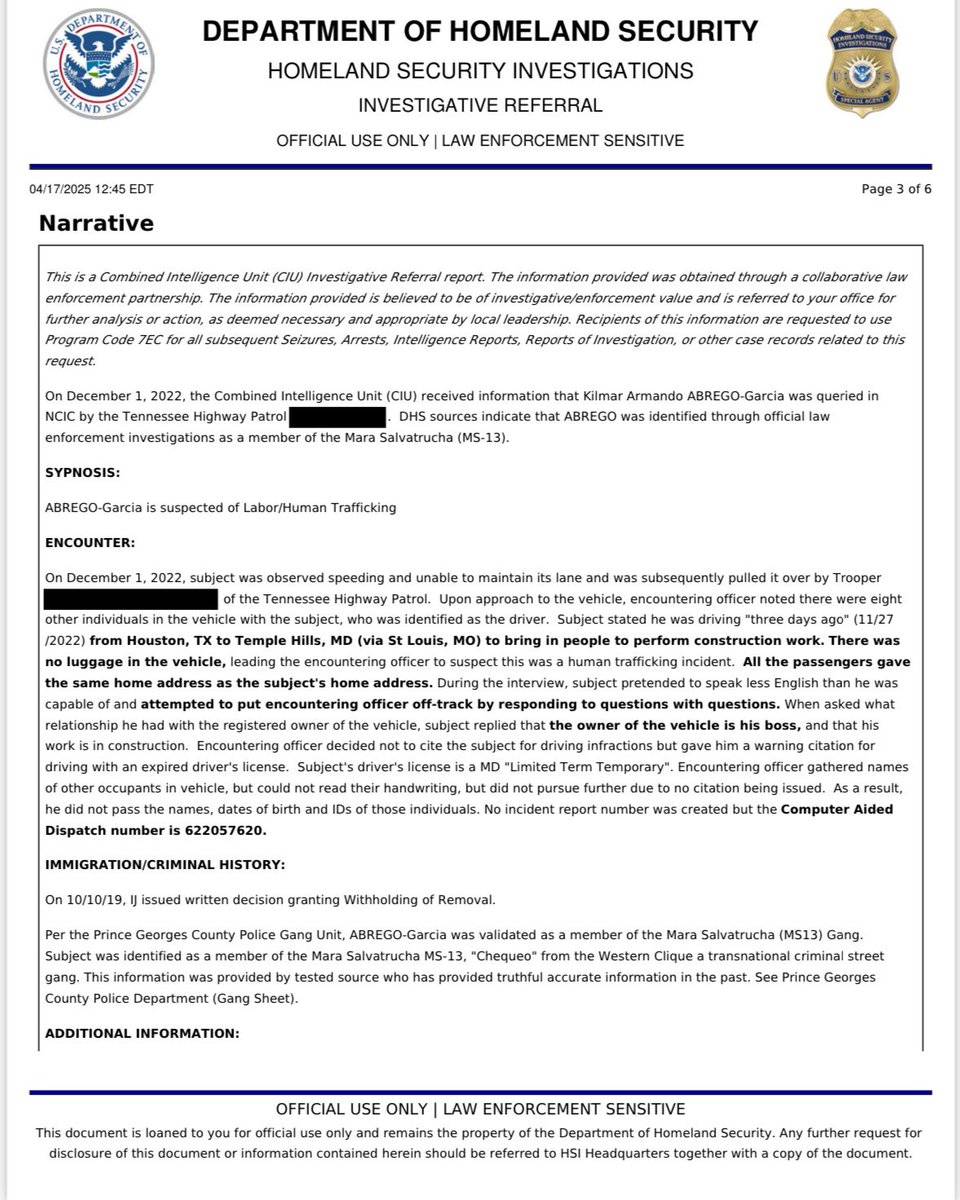 NEW: DHS has provided @FoxNews a bodycam image & HSI report from when Kilmar Abrego Garcia was pulled over by Tennessee Highway Patrol & was suspected of human trafficking in 2022. Per report, he had 8 people w/ no luggage in the car w/ him, & claimed to be driving them from TX to MD for construction work. Every passenger gave the same home address as Abrego Garcia’s address. The report says Abrego Garcia was evasive during questioning, and had an expired license. He was not arrested or charged with any crime in relation to the incident. DHS says the report has yesterday’s date due to redactions made of law enforcement sensitive info for public consumption, but this is an old document.
