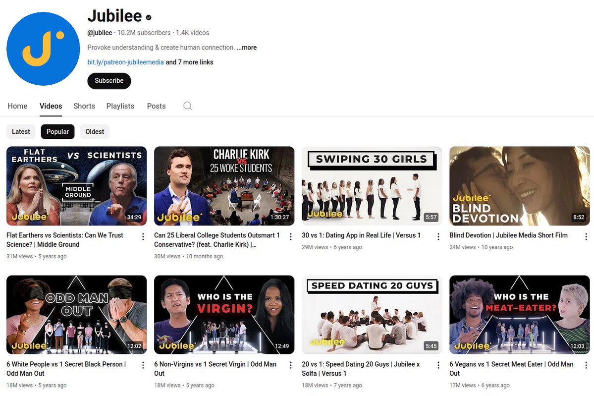 And each page has very different agendas YouTube channel Jubilee tries to "provoke understanding & create human connection." Some of it's most popular videos are: -Flat Earthers Vs Scientists -Charlie Kirk vs 25 Woke Students -Swiping 30 people in a real life version of Tinder