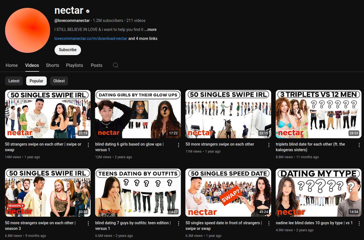 Meanwhile, Jubilee Media's Nectar YouTube page promises viewers: "I STILL BELIEVE IN LOVE & i want to help you find it" It's most popular videos show: -More dating app "swiping" people in real life -Dating people by their "glow-ups" -Various iterations of speed dating games