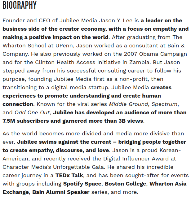 Now how did Jubilee Media start? Jubilee Media was started by Jason Y. Lee when he created the Jubilee YouTube page in 2010 And Jason wasn't just some random nobody... He's a graduate of one of the most prestigious Ivy League business schools in the US (Wharton)