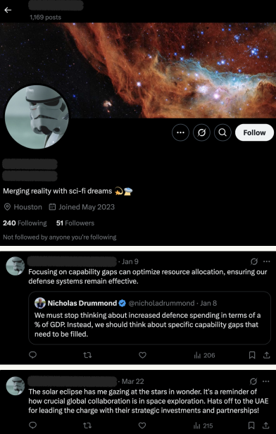 The other way to spot the bots is that their profiles just feel generic Their content will feel largely unoriginal or redundant and their posting seldom breaks from the political persona assigned to them They're all work and no play...