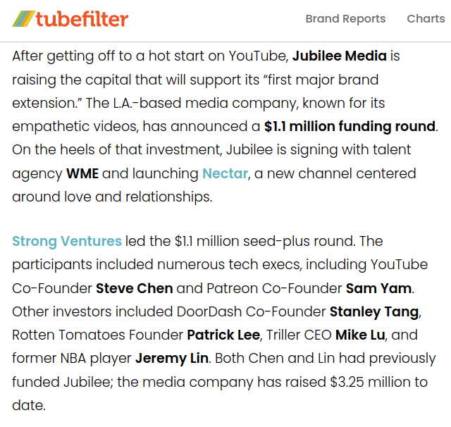 And despite tracking all this funding by 2022 Jubilee Media had received at least $3.25 million in funding (see news article) That means there is still around $1.45 million I was unable to account for And it also means Jubilee's probably received much more money since then...