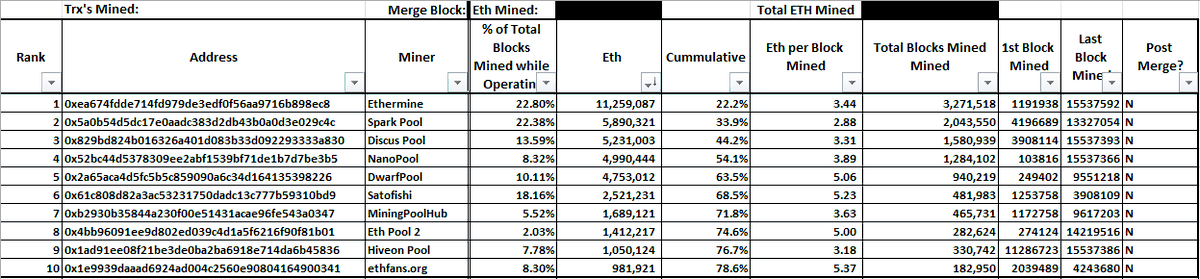 Ethereum's Mining only added to Ethereum's Centralization Did you know that the Top 10 Mining address' on Ethereum prior to the Merge, were over 24,000 times more likely to mine the next block, than the average of all other Ethereum mining address'? The AVERAGE % share of Blocks Mined, for All Mining Address', between their First and Last Block Mined: 0.00049%. The Average for the Top 10: 11.9% The result of this in terms of ETH? The Top 10 Mining reward address' received over 78% of the $ETH rewards from the Genesis block up until the Merge ---> 39.77M ETH in total. While the majority of the Top 10 address' were Mining Pools, the Pools themselves were Centralized. The majority of the ETH rewards paid out from these mining pools flowed to entities like Consensys, Wanxiang, and Ethereum's "masked" whales. While below is a snapshot showing these relationships, its merely a snapshot. I say that because there are endless examples of ETH flowing to exchange address' owned by these same entities. All Time Top 10 Ethereum Mining Pools prior to The Merge (POW-->POS) I wonder who else could have received ETH outside of these 3 entities ❓❓❓ Do You ❓❓❓❓❓❓❓❓❓❓❓