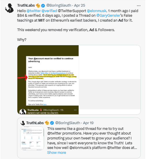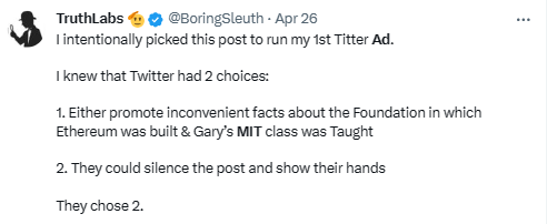 I thought that my research showing Gary teaching a fake history on Ethereum was important. I started my first ever Twitter (X) ad. It was removed 2 days in, my paid for account was stripped & my followers for a moment :).