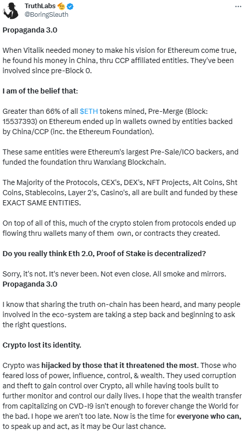 Today, a bill was proposed in the US Government, Outlawing Government use of China-made blockchains and Tether $USDT. China’s made a lot of blockchains… and where they aren’t developing them, they are invested heavily in them, so much so they have a controlling interest. Just look at Ethereum, and all their involvement in and around the Ecosystem. They are behind Prometheum, it says it in their filings that the SEC approved in 2020. Yesterday, I told you of their involvement on-chain with USDT. You can lookup “@Boringsleuth CCP” and find all sorts of research. The head of CCP controlled Wanxiang Blockchain, and key official of Longling Capital & Prometheum is Dr. Bo Feng. Wanxiang is who setup and funded Vitalik Buterin and the Ethereum Foundations wallets, and had invested in over 500 Cryptocurrencies by 2021. Dr. Feng stated in March of 2019 that China should be the first mover into CBDCs & Stablecoins, and just their NAME ALONE would be enough backing a Stablecoin, that they wouldn’t actually need any real assets, or money backing it. You all seriously think Tether is backed? How many other protocols aren’t backed like FTX? Binance.. OKC? Yunbi? I could go on and on. The days are numbered. The word of the Truth is spreading. Stay safe. Stay curious. 🫡