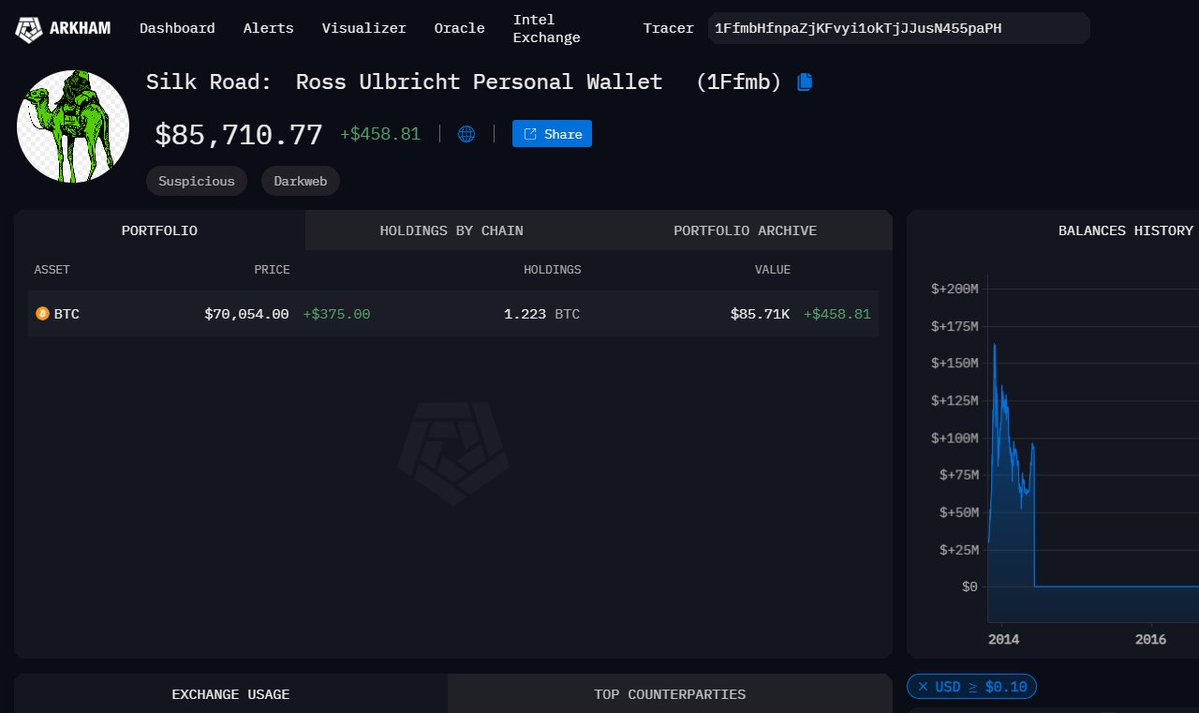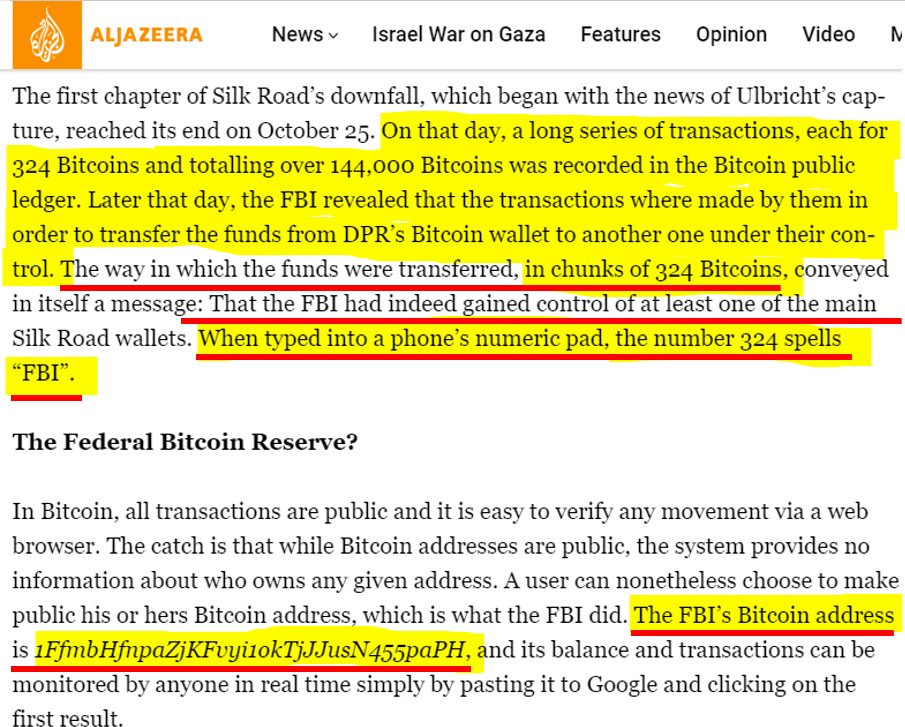 Hey @ArkhamIntel, you got the most important address in Crypto wrong on your site. This is the @FBI Bitcoin wallet, not Ross Ulbricht's. Per @AlJazeera, and backed by transactional evidence and court filings, 1FfmbHfnpaZjKFvyi1okTjJJusN455paPH is an address owned by the FBI. They sent Dead Pirate Roberts (Ross Ulbrichts) seized BTC to this address in chunks of 324 BTC, which on a telepad, spells out 'FBI'. You should fix this, as there are many concerning false Tags on wallets on your website. I can't stress the importance of having factual labels on a Data Website, without it you lose all integrity and trust. If you aren't aware, Silk Road wasn't just a case about Ross, but also revealed a couple Rogue Agents. Shaun Bridges, of the Baltimore Task Force, and DEA special agent Carl Force, were both arrested, serving years in prison, and released. I included that link below. https://arstechnica.com/tech-policy/2016/08/stealing-bitcoins-with-badges-how-silk-roads-dirty-cops-got-caught/ We wonder why this may not be labeled correctly, so it had us thinking, if we were to trace the BTC from the address' in the court filings, what would we find? Would all of that BTC stolen had been seized, or did a lot of it end up elsewhere? I'd ask you, but you clearly either don't know, or don't want others to know.🤔 As someone who has been directly threatened by the FBI since November 2022, for looking into Crypto fraud, and the FTX incident, I take this very personal. More to come. 🫡