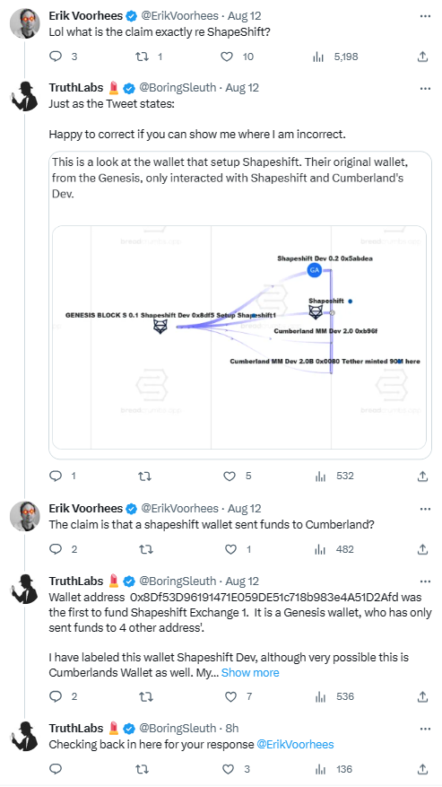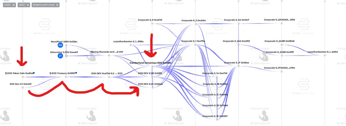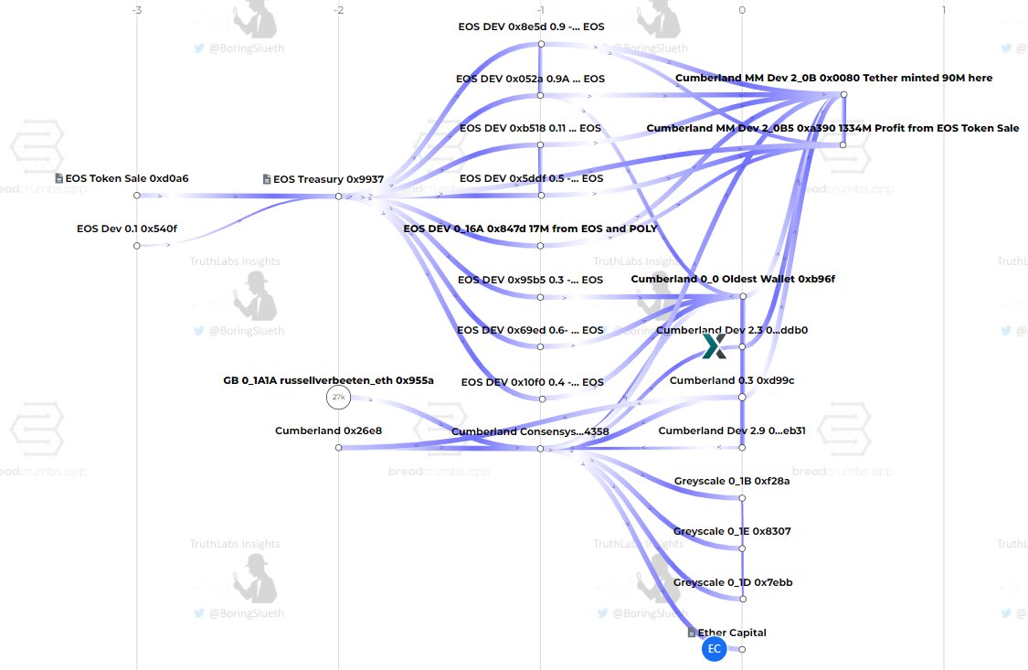 🚨 Was @greyscale setup to be the offramp for EOS's token sale ETH as well as Consensys and the Ethereum Foundation's hidden ETH? Blockchain forensics evidence hints to this. Did you know that @greyscale's Ethereum tokens primarily, entirely comes from the EOS token Sale, Cumberland DFW Labs, & a network of wallets that holds RusselVerbeeten.eth, who happened to work for Ethereum prior to launch, and then Consensys for 6 years? Greyscale's inbound funds can be seen in this forensic map, which shows where they received their funding from. I rebuilt this tonight from information received from my Team. If you aren't familiar with EOS' story, its a failed, Chinese blockchain which raised $4.1 Billion from VC's @fenbushi and @VitalikButerin, Cryptology AG @novogratz & Theil. The head of the EOS Foundation would go on to say that “The token sale for EOS shattered and broke all previous records in terms of funds raised", which it did by Billions. They then went on to raise an additional $60M from DWF labs/ Cumberland shortly after the ICO. The ICO was riddled with allegations of fraud and corruption, though no charges or fines were ever brought foward. I've included the Tweet below, showing the Token Round Structure and the VC's involved, as well as this map 👇 In addition to this, 3 of the Top 4 inbound wallets to Cumberland's oldest known wallet, received their ETH from the EOS token Sale, and most of the EOS ETH worth $4B at the time, ended up going thru Cumberland 👇 EOS Brendan Blumer also took a 9% stake in $SI Silvergate Bank, which infamously collapsed 4 months after the FTX fallout. Theil, who was an investor in EOS, warned his counterparts and associates to pull their funds out at the same time, seemingly causing a run on the bank less than 24 hours later. 🤷♂️ And finally, since I love @erikvoorhees so much, the original wallet that setup Shapeshift, only EVER interacted with Shapeshift and Cumberland's Dev, wallet. When I brought it up, Erik was suprisingly anxious, failing to answer questions, and then disappearing, something that's became all to common with him prior to him blocking me. Until next time, stay curious my friends. 🫡
