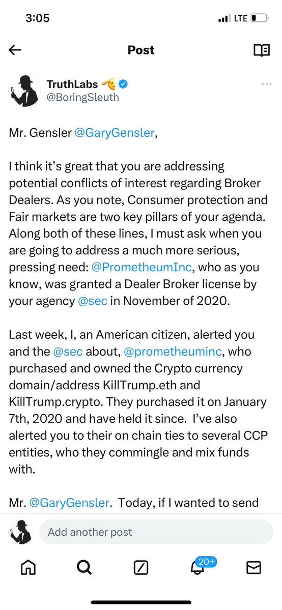 Mr. Gensler, I appreciate your words calling out bad actors within the Crypto and Digital Assets ecosystem. When will your words turn into actions? To date, only one company in the History of the Universe has been granted a Special Dealer Broker License for Digital Assets. This Company, Prometheum, which you granted it to, is deeply tied to the CCP. They also own the Digital assets, KillTrump.eth and KillTrump.Crypto. They purchased them on January 7th 2020. They still own these assets, and they still have the only ever license. So I’ll ask again: When will your actions match your words? https://x.com/boringsleuth/status/1684285745358336002?s=46