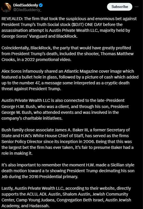 BREAKING: The firm that took the suspicious and enormous bet against President Trump’s Truth Social stock ($DJT) ONE DAY before the assassination attempt is Austin Private Wealth LLC, who is directly linked to George Bush, Blackrock, and George Soros. George Bush is directly linked to not only Austin Private Wealth, but to the company who purchased the Domains KillTrump.Crypto and KillTrump.ETH on the Ethereum blockchain in 2020. If you recall, the lone Crypto Company Prometheum was given the ONLY EVER Special Purpose Broker Dealer License by @GaryGensler & the @SECGov. Prometheum, is majority owned by Wanxiang, some might call it a regulatory spinoff.. Wanxiang is a CCP affiliated company, with its US Headquarters in Chicago, who's done major business deals with George Bush, Obama, and the Bidens. Prometheum is who created and purchased the domains KILLTRUMP.Crypto and KillTrump.eth on January 7th, 2020, and set the expiration date on January 6th 2021. Account @DiedSuddenly_ breaks down the Bush, Blackrock, and Soros connections below and here: https://t.co/qW9uDN4Xa4