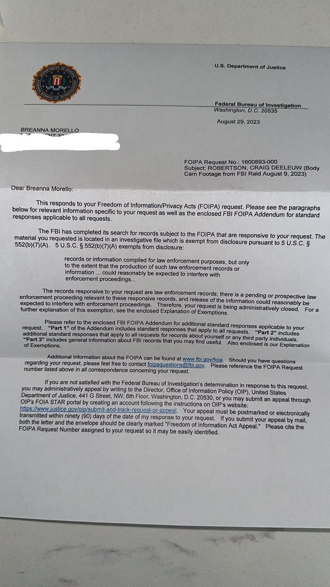Last month, I asked the FBI to provide me with the body camera footage & communications regarding the fatal shooting of a Utah man. The FBI has just rejected my request. They claim it’s exempt because it interferes with “enforcement proceedings.” Craig Robertson is dead. The DOJ pressures local law enforcement agencies to immediately release body cam footage after a shooting—why does the FBI think they should get special treatment?