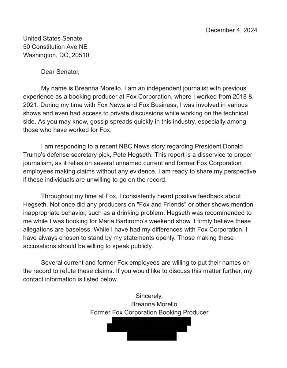 Running a hit piece on a man that's solely based on anonymous sources is cowardly and isn't journalism. I'm willing to go on the record regarding Pete Hegseth. As a former Fox booking producer, I've never heard a negative remark about Hegseth--until now. This is the letter I am sending EVERY Senator.