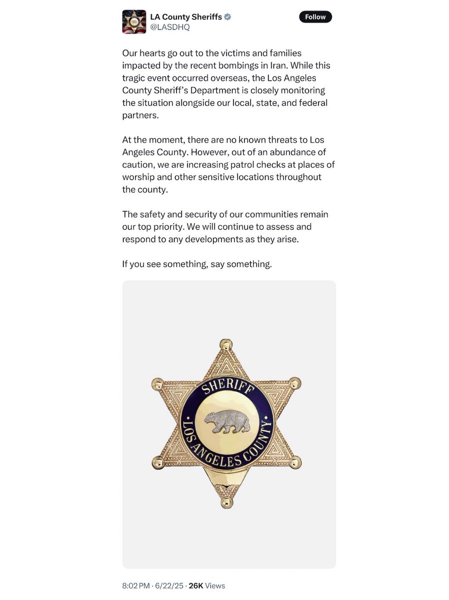 LA County Sheriffs deleted their post sending condolences to Iran. The internet doesn’t forget. https://t.co/F2RZoCUEwR