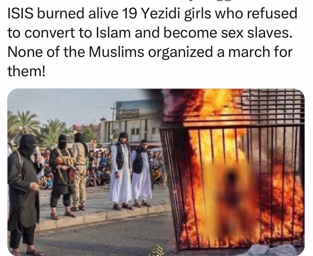 As the pro-Palestinian movement has spread beyond Arab American and Muslim communities to young people and progressives, and across college campuses I want to remind you what these people are capable of. ISIS Burns 19 Yazidi Girls Alive In Iron Cages For Refusing To Be Sex Slaves https://www.dailywire.com/news/isis-burns-19-yazidi-girls-alive-iron-cages-amanda-prestigiacomo