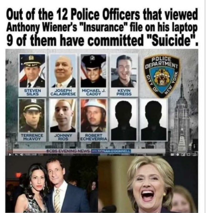 Did you know 9 out of 12 Police Officers who viewed Anthony Wiener's "Insurance" file on his laptop have committed "Suicide?” .@Kash_Patel perhaps an investigation is warranted. https://t.co/fKswKa53t8