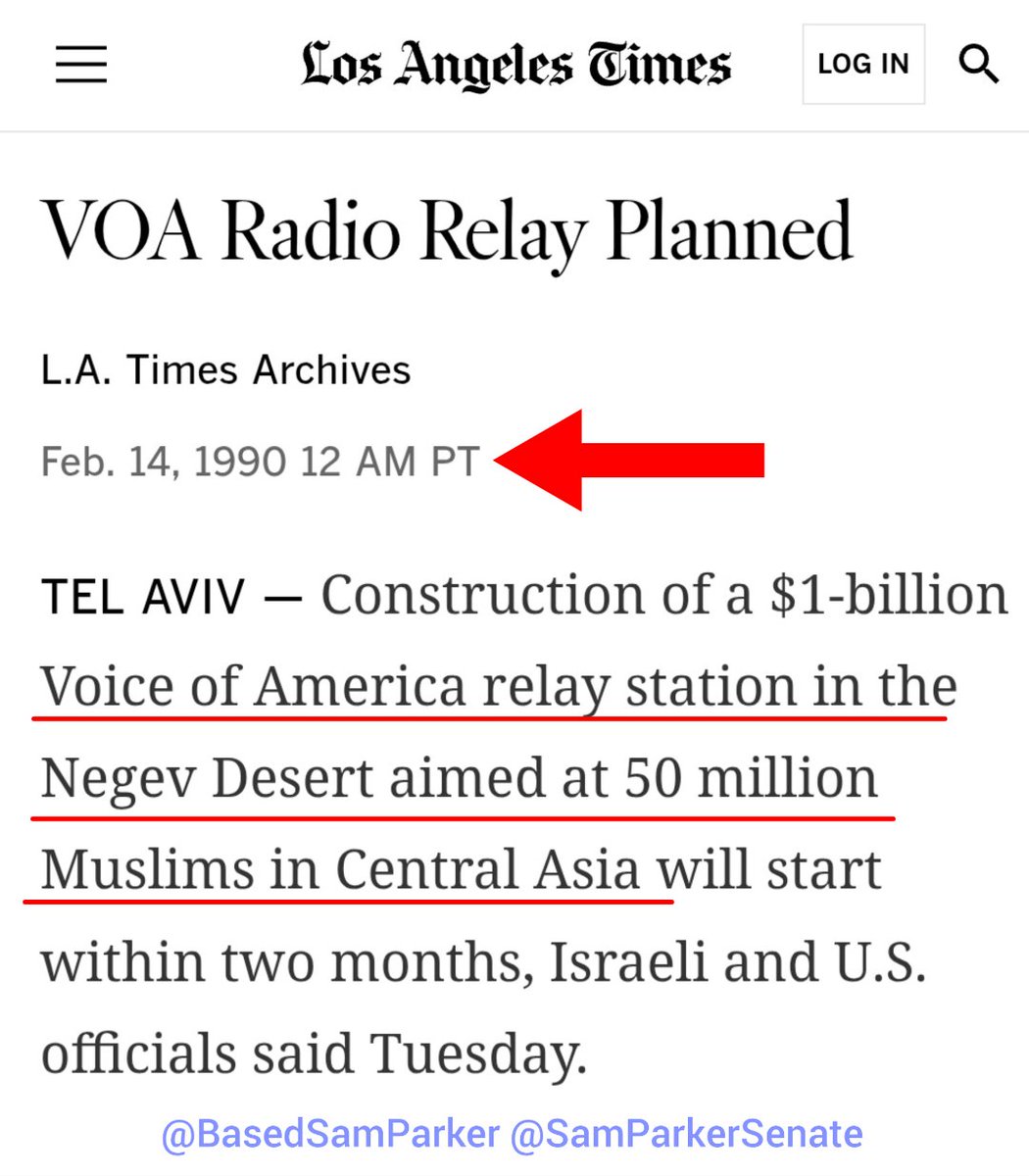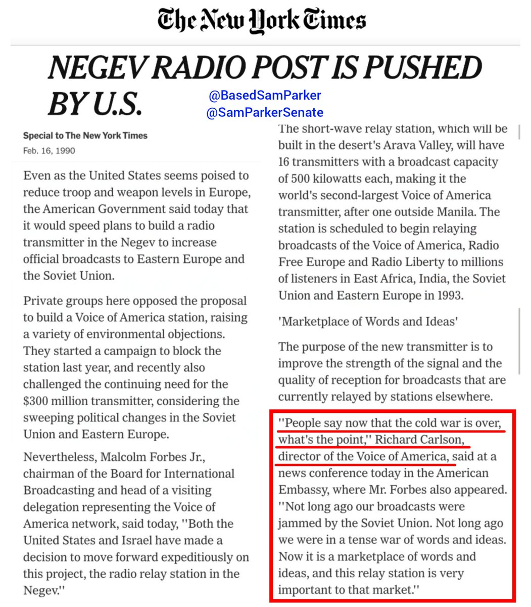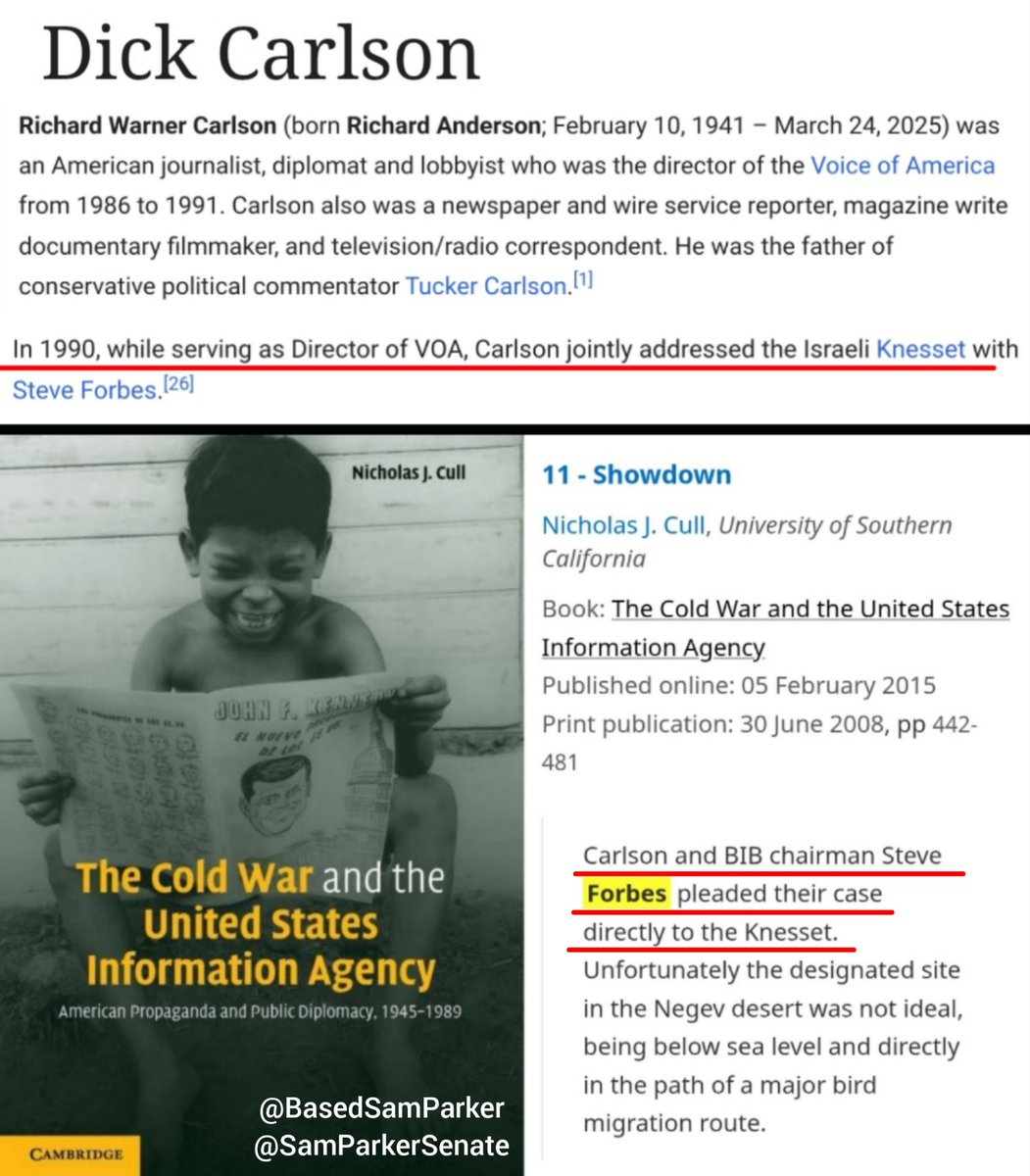 DID YOU KNOW? In February 1990, Dick Carlson—Tucker Carlson's Father—spoke to the israeli knesset while he was a CIA operative running the Voice of America? They wanted to put a network of transmitters in the Negev desert to broadcast propaganda to "50 million Muslims in Central Asia." It was the end of the Cold War, and some people questioned the move, wanting to know why it was necessary anymore. Carlson said that it was still about dominating the marketplace of words & ideas. I find the timing and target of this messaging suspicious, since 6 months later in August 1990, Saddam Hussein invaded Kuwait, igniting the First Gulf War, aka Desert Storm. If you watched @NickJFuentes's stream last night, you know that it was a bunch of Neocon jews who agitated for that war. A war which Pat Buchanan objected to on those grounds, and whose objections Tucker Carlson later criticized. Might be nothing. But it's all kinda curious, don't you think? What will we find if we keep digging?