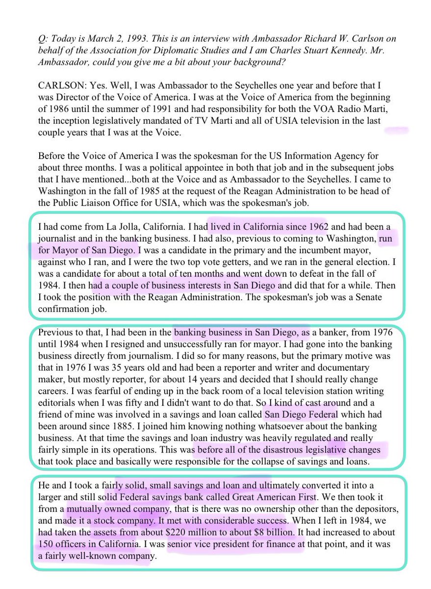Dick Carlson ran for Mayor of San Diego ▪️converted San Diego Federal savings & loan to Federal Great American First. $220M —> $8B ▪️close friend of CA Governor Pete Wilson ▪️cop in Ocean City MD ( 😹) ▪️wife’s uncle is Senator Fulbright ▪️Chris Boynton CFO of Batelle and Raytheon. (Brother?)