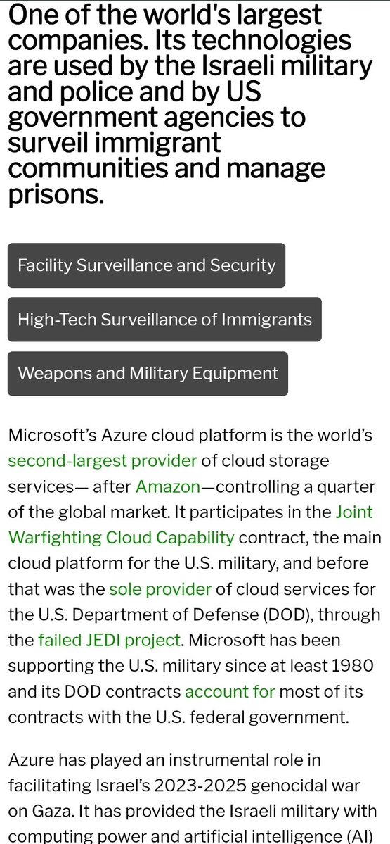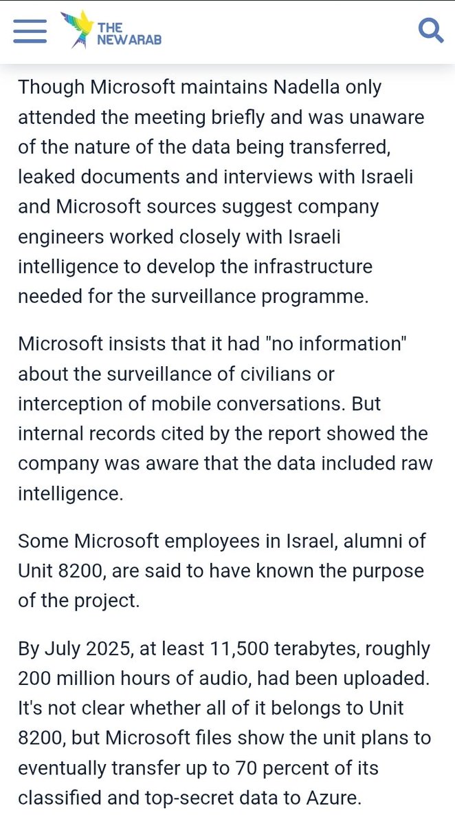 Microsoft Azure & Unit 8200 Microsoft developed a customized version of its Azure cloud platform specifically for Israel's Unit 8200, providing critical infrastructure to store and process massive amounts of surveillance data, including audio files from millions of calls intercepted in Palestinian territories. This collaboration was initiated after a 2021 meeting between the former head of Unit 8200 and Microsoft CEO [Satya Nadella], with the company building a segregated area within Azure to meet the military's needs—allowing storage and analysis at a scale that exceeded what Israeli military servers could handle. By July 2025, about 11,500 terabytes of Israeli military data (hundreds of millions of hours of audio) were stored in Microsoft's cloud centers, mainly in the Netherlands, with smaller caches in Ireland and Israel. Microsoft engineers, some of whom were reported to be Unit 8200 alumni, worked closely with the unit to enable this transition. The system reportedly allows Unit 8200 to process up to “a million calls an hour,” revolutionizing their ability to monitor, analyze, and act on intercepted communications throughout Gaza and the West Bank. Intelligence gathered from the Azure-based system has reportedly informed military operations, including strikes and arrests. Microsoft has stated that its engagement with Unit 8200 was intended to strengthen Israel’s cybersecurity and protect against cyber threats, not for surveillance of civilians, and claims it found “no evidence” that its technology directly harmed people in Gaza. However, internal documents and whistleblowers argue the partnership has facilitated significant mass surveillance and contributed operationally to the Israeli military’s activities. The financial and technical collaboration between Microsoft and Unit 8200 has drawn heavy scrutiny from human rights organizations and even Microsoft employees, as the company reportedly stands to generate hundreds of millions of dollars from these military contracts in the coming years.