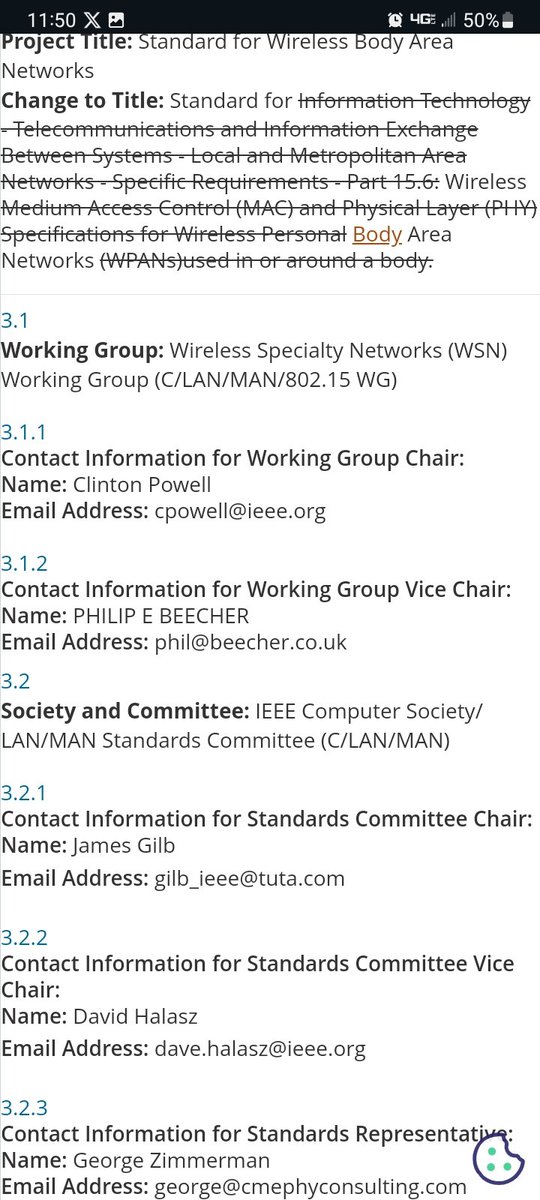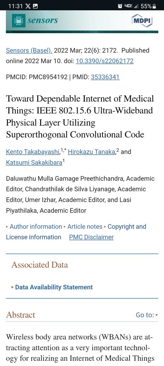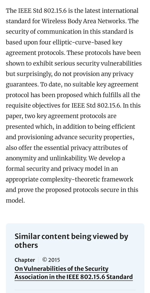 Human Body Communications The IEEE 802.15.6 standard defines three physical layer (PHY) options for Wireless Body Area Networks (WBANs): Narrowband (NB), Ultra-Wideband (UWB), and Human Body Communications (HBC). The Human Body Communications (HBC) PHY utilizes the human body as a transmission medium for electrical signals. HBC PHY: - Operates in the 16 MHz band - Supports data rates up to 10 mbps - Uses electric field propagation through the human body [but not limited to humans]💥 - Enables communication between devices in direct contact with the body and implanted materials (self-assembling nano)💥 - Provides a low-power and highly secure communication channel with NO Privacy - Suitable for low data rate applications like health monitoring sensors But why? Biosurveillance . Biohacking . Control . Depop . ??? The HBC PHY takes advantage of the signal propagation properties of the human body to enable communication between body-worn devices or implanted devices. It offers a highly secure communication channel as the signals are confined within the body, reducing interference and eavesdropping risks. 🤔 Remind you of the movie 'Johnny Mnemonic' at all? If not here's a refresher 👇 🍿 https://t.me/Revelations_and_Rabbit_Holes/3238 IEEE 802.15.6-2012 [Inactive]- IEEE Standards Association https://standards.ieee.org/ieee/802.15.6/5364/ Toward Dependable Internet of Medical Things: IEEE 802.15.6 Ultra ... https://ncbi.nlm.nih.gov/pmc/articles/PMC8954192/ What is WBAN or IEEE 802.15.6? - everything RF https://everythingrf.com/community/what-is-wban-or-ieee-802-15-6 IEEE 802.15.6 standard in wireless body area networks from a ... https://ieeexplore.ieee.org/document/7581523 "New technologies integrating with artificial intelligence neural networks." Sensors and Sensing Devices Utilizing Electrorheological Fluids and Magnetorheological Materials-A Review- Sensors(Basel) https://pubmed.ncbi.nlm.nih.gov/38732948/ [1102.4106] An Overview of IEEE 802.15.6 Standard - ar5iv - arXiv https://ar5iv.labs.arxiv.org/html/1102.4106 IEEE 802.15.6 standard in wireless body area networks from a ... https://ieeexplore.ieee.org/document/7581523 IEEE 802.15.6-2012 - IEEE Standards Association https://standards.ieee.org/ieee/802.15.6/5364/ My Project-WBAN inactive https://development.standards.ieee.org/myproject-web/public/view.html#pardetail/4550… International Journal of Information Security- Article Pragmatic authenticated key agreement for IEEE Std 802.15.6 https://link.springer.com/article/10.1007/s10207-021-00570-7?error=cookies_not_supported&code=e3e59977-e20a-4bc4-a6f4-87a5253254c6… The security of communication in this standard is based upon four elliptic-curve-based key agreement protocols. These protocols have been shown to exhibit serious security vulnerabilities but surprisingly, do not provision any privacy guarantees. To date, no suitable key agreement protocol has been proposed which fulfills all the requisite objectives for IEEE Std 802.15.6.