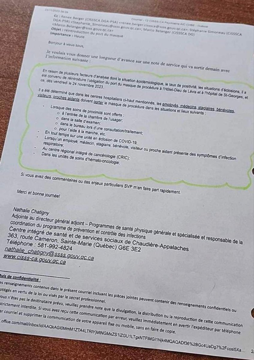 🚨Qu’est qu’on disait dont ? 🚨C’est à vous de dire non, tous ensemble. «En raison de plusieurs facteurs d'analyse dont la situation épidémiologique, le taux de positivité, les situations d'éclosions, il a été convenu de réintroduire l'OBLIGATION du PORT du MASQUE de procédure à: ▪️HÔTELS-DIEU DE LÉVIS ▪️HÔPITAL DE ST-GEORGES des vendredi le 24 novembre 2023. Il a été déferminé que dans les centres hospitaliers ci-haut mentionnés, les: ▪️employés ▪️médecins ▪️stagiaires ▪️bénévoles ▪️visiteurs ▪️proches aidants doivent porter le masque de procédure dans les situations et lieux suivants : » 👇 @Alexis_Cossette