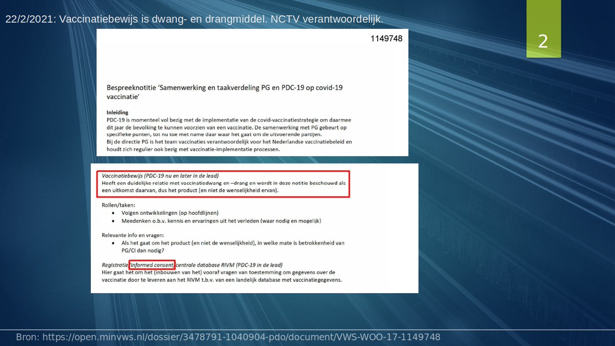 Uit een gespreksnotitie tussen directie Publieke Gezondheid en Programmadirectie Covid-19 blijkt dat men het #CTB ofwel de #QR-pas beschouwde als een dwang- of drangmiddel voor vaccinatie. Het was dus niet te doen om besmettingen te voorkomen, zoals het CTB aan de burgers werd verkocht. Informed consent beschouwde men als het geven van toestemming voor het delen van de vaccinatiestatus met het administratiesysteem CIMS. Dus niet in de Neurenbergse context.