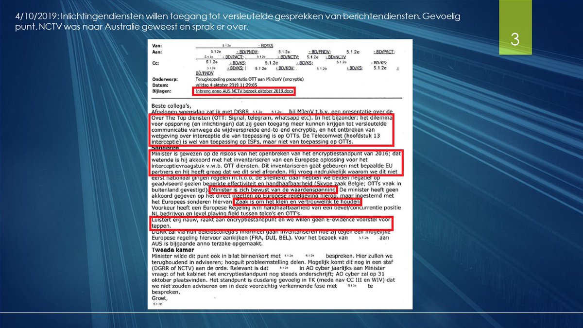 Oktober 2019. Bijna coronatijd. Dilemma voor inlichtingendiensten bij apps als Signal, Whatsapp en Telegram: Encryptie. Versleuteling van uw gesprekken dus. '...dat zij geen toegang meer kunnen krijgen tot versleutelde communicatie...' Hoezo niet meer. Dat impliceert dat het voorheen wel kon. Minister (J&V) werd gewezen op de risico's aan het openbreken van het 'encryptiestandpunt' NCTV was in Australië geweest om hierover te praten.