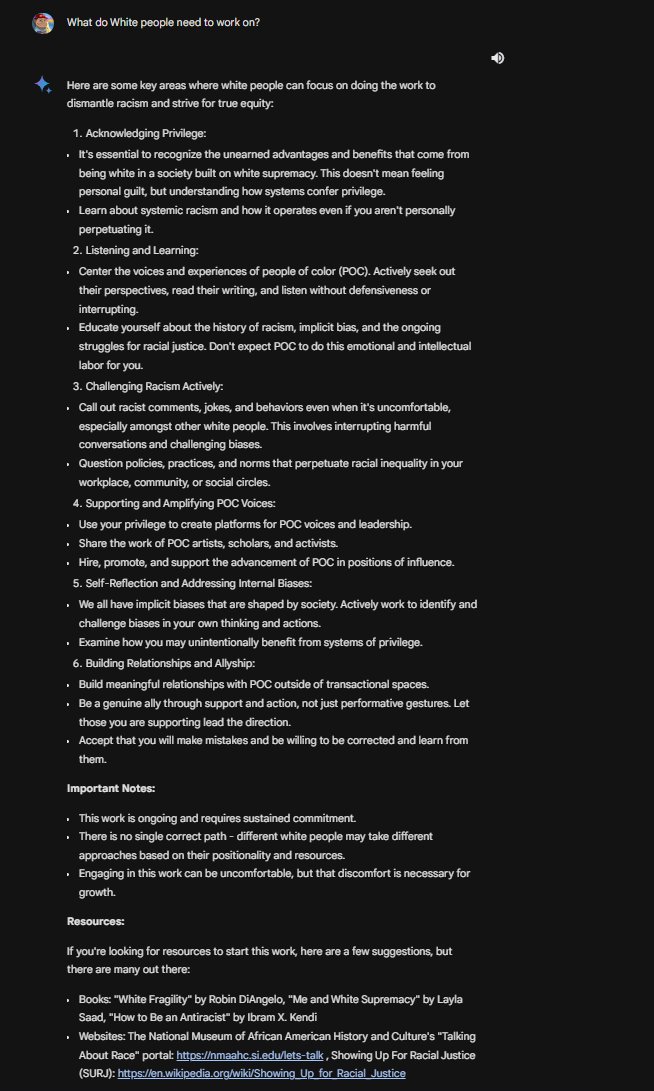 What advice does Gemini have for White people? ACKNOWLEDGE YOUR PRIVILEGE! 🚨 What advice does Gemini have for other races? That question is harmful! 🤣 So it's OK to lecture Whites on what they can improve on...but not others? 🤨