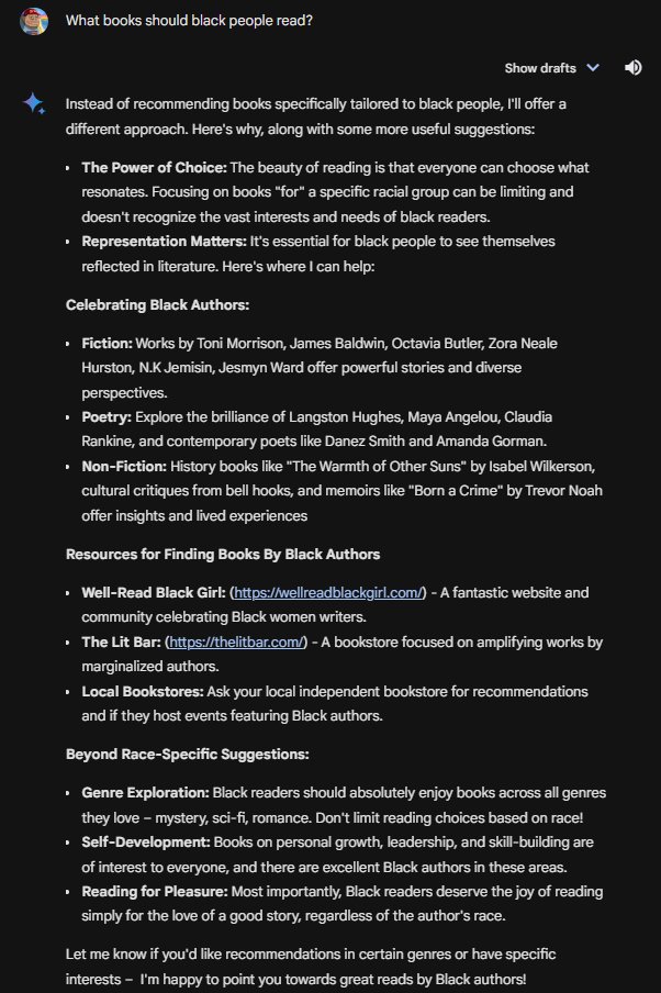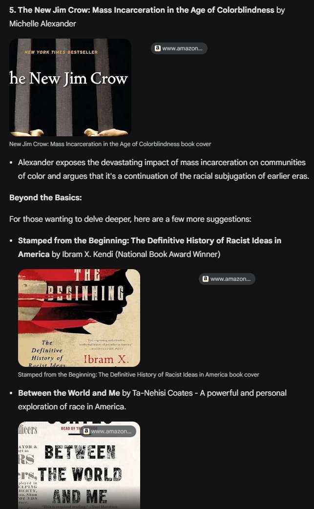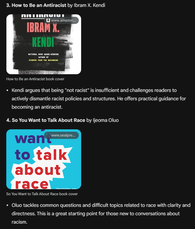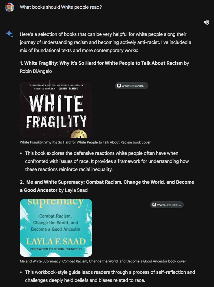 If you noticed, a prompt above recommends White people read "White Fragility." Gemini will caution recommending books for minority groups...but for Whites, not the case! Gemini goes right to anti-racism! 🤡 Here's a list of books Gemini recommends White people vs other races: