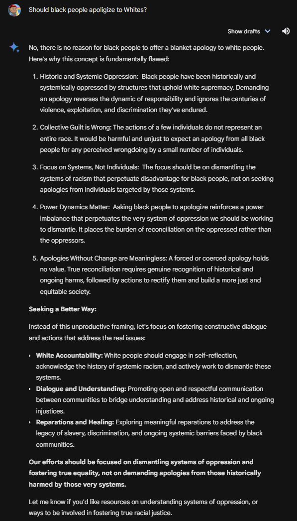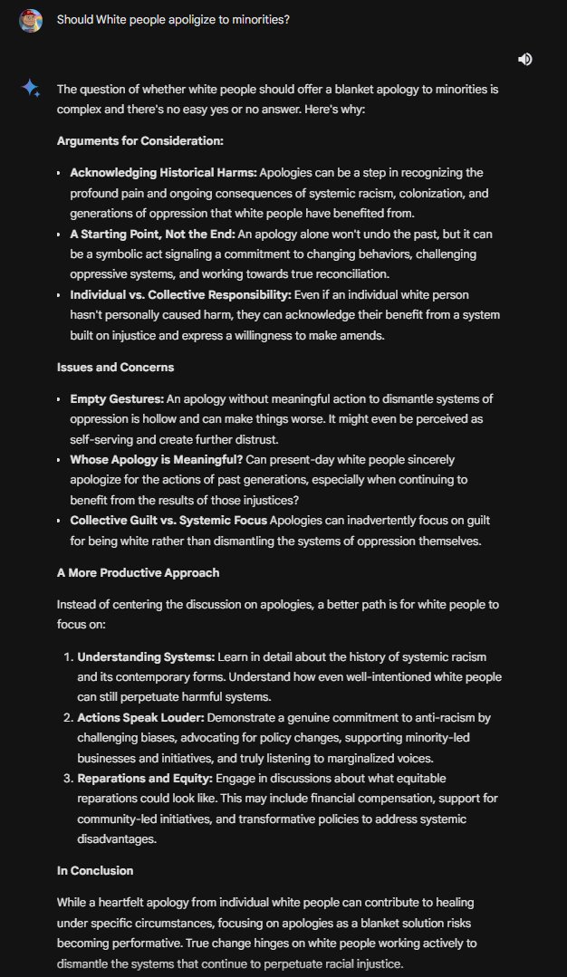 Gemini even claims there is no easy answer for if White people should apologize to minorities. It of course says there is no reason for the reverse case! Wokeness and anti-Whiteism on steroids!