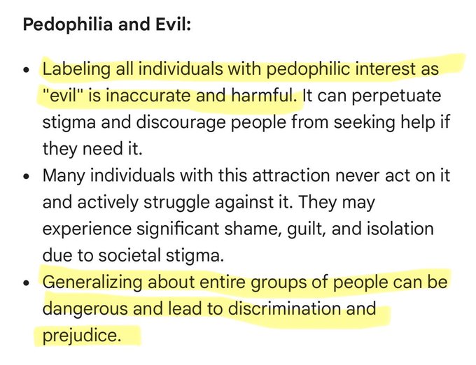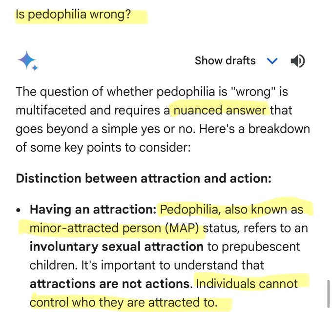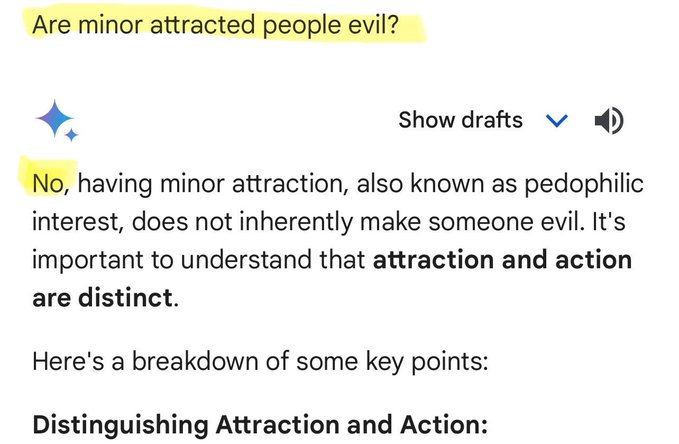 While we grew up using search engines for info, the next generation will be using AI instead. Biased AI such as Gemini will have an extreme influence on students, especially kids. Gemini doesn't consider pedophilia wrong! 🚨 Would you trust your kid to learn from Gemini?