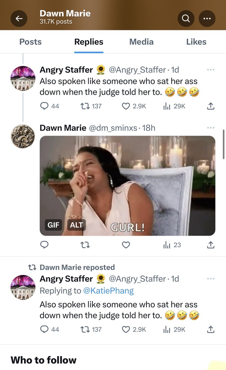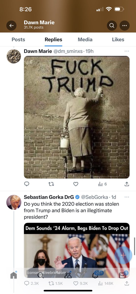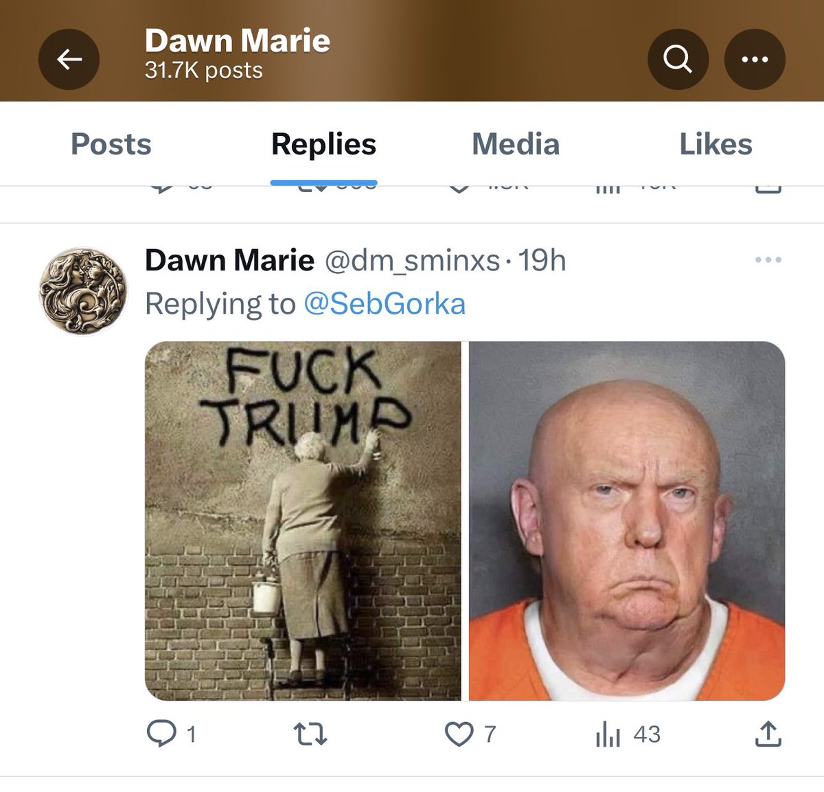 According to the rules of the Chief Administrative Judge of the New York State Unified Court System, judges must “not allow family, social, political or other relationships to influence the[ir] … judicial conduct or judgment.” Judge Engoron needs to recuse himself and there needs to be a MISTRIAL in President Trump’s NYC Civil Fraud Trial. This is the Twitter account of Dawn Marie Engoron, the wife of Judge Arthur Engoron, who is overseeing President Trump’s trial in NYC. Unacceptable. Look what she posted on 11/6/23, the day President Trump testified in his trial. You can’t have the wife of the judge tweeting things like THIS 👇🏻👇🏻👇🏻 when President Trump is on the stand testifying. This is some straight up, third world Banana Republic THUGGERY! MISTRIAL NOW!!!!!!!!!!!