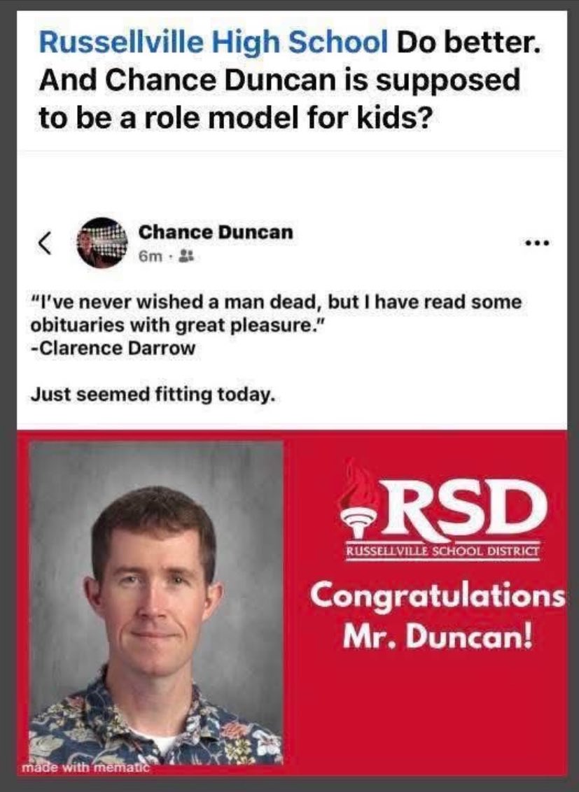 What is the Russellville School District doing about this person? He shouldn’t be allowed to influence Arkansas children. Russellville Schools 479-968-1560 #ARPX https://t.co/J5rRioKnQc